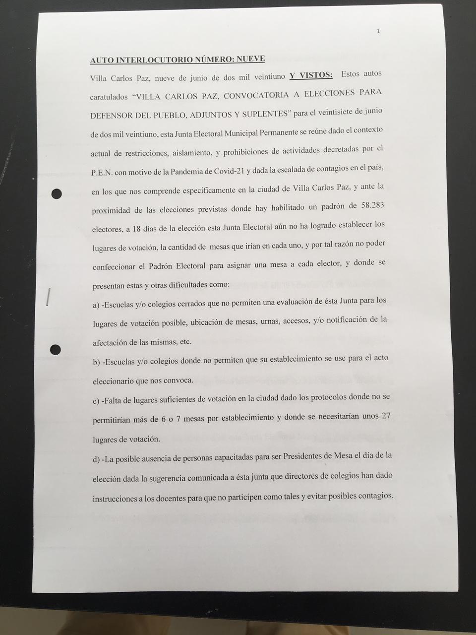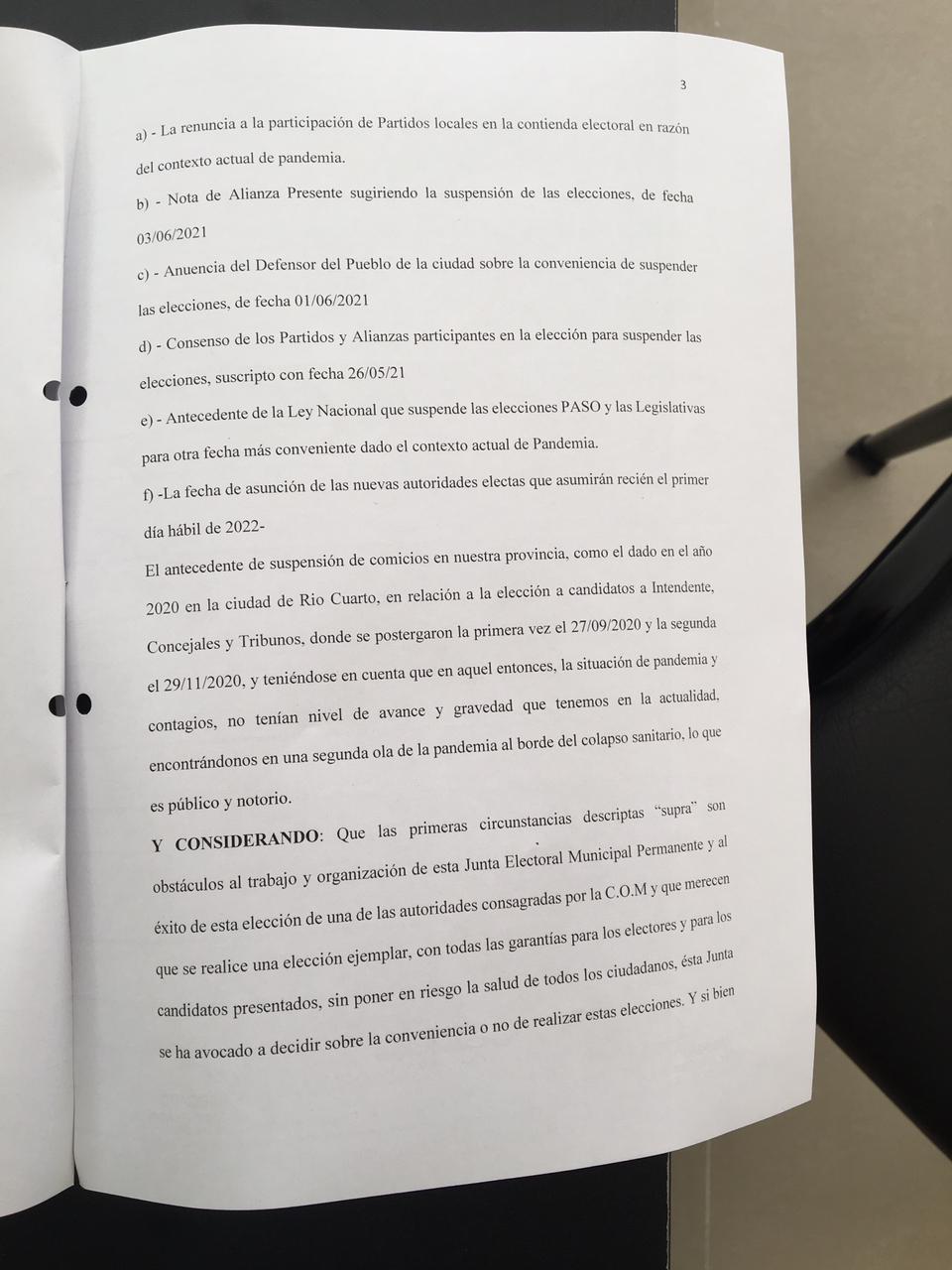 Entre los fundamentos que se planteó para la resolución se encuentra el antecedente de suspensión de las PASO que se iban a celebrar en agosto en el país; la “anuencia” del Defensor del Pueblo sobre la conveniencia de suspenderlas, el consenso de los partidos partidos políticos y alianzas participantes, y otro antecedente, el de los comicios municipales de Río Cuarto, en 2020.