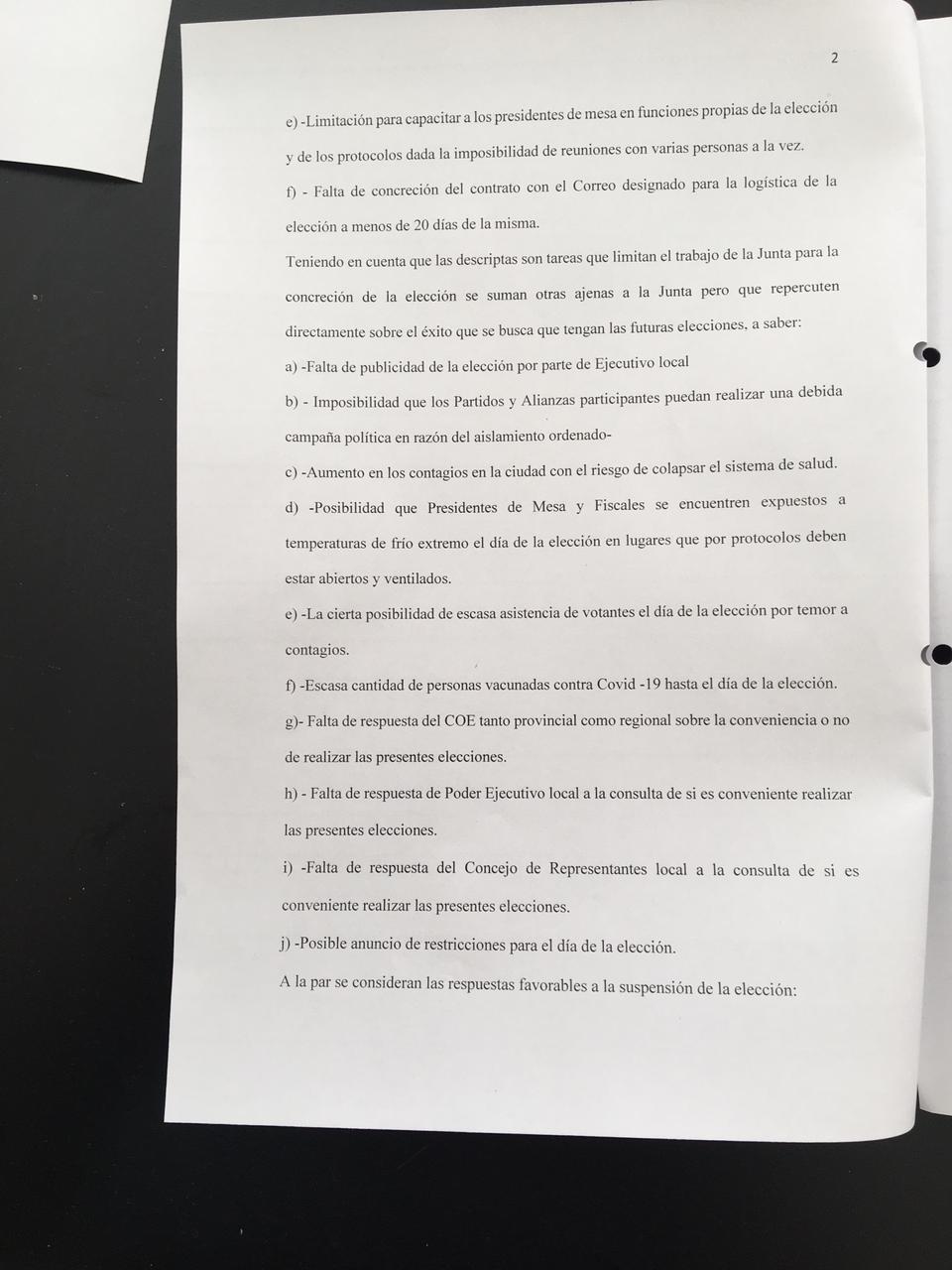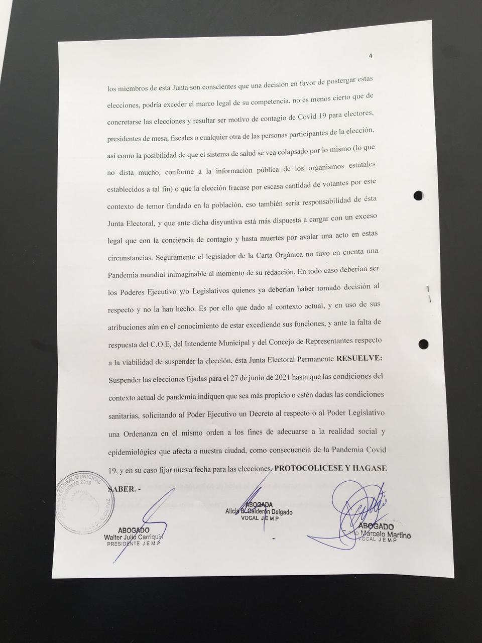 La resolución plantea la suspensión de las elecciones “hasta tanto las condiciones del contexto actual de pandemia indiquen que sea más propicio o estén dadas las condiciones sanitarias, solicitando al Poder Ejecutivo un decreto o al Poder Legislativo una ordenanza en el mismo orden a los fines de adecuarse a la realidad social y epidemiológica que afecta a nuestra ciudad como consecuencia de la Pandemia y en su caso fijar una nueva fecha para las elecciones”.