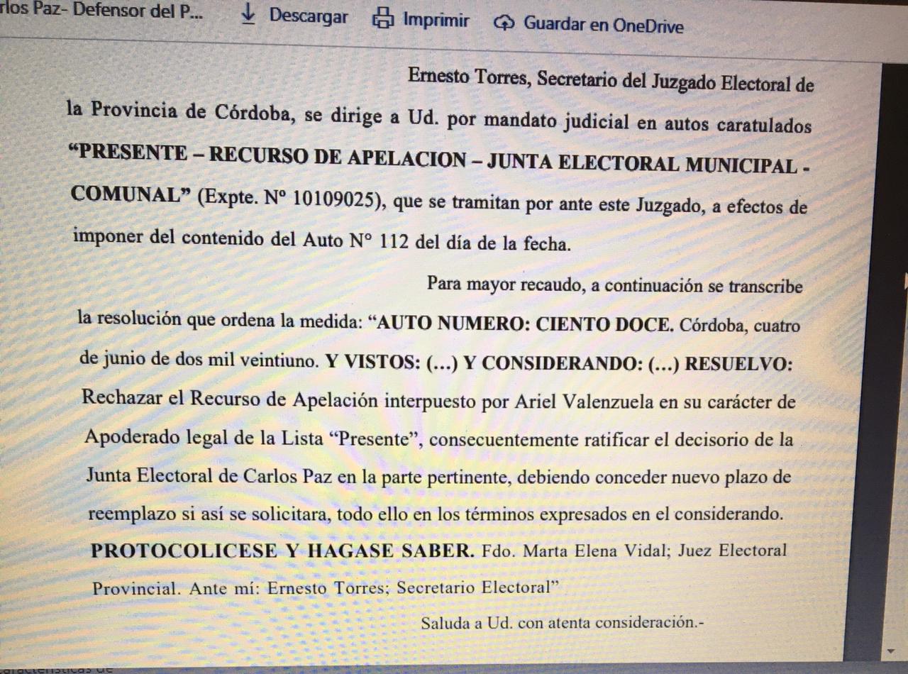 La impugnación planteó como principal impedimento para la oficialización de la candidatura que Pujol no votó en los últimos comicios municipales de Villa Carlos Paz por tener domicilio en Villa Santa Cruz del Lago.
