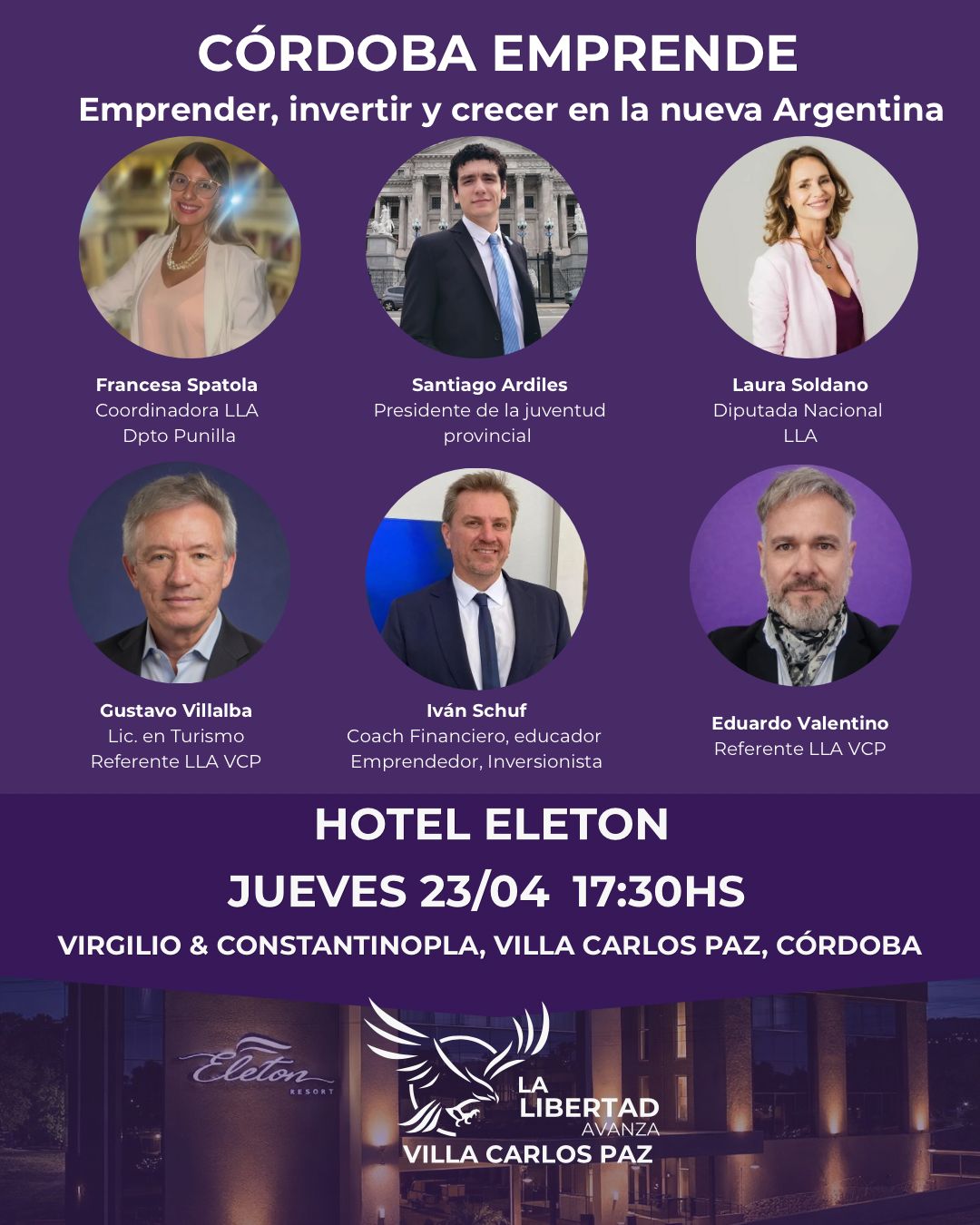 El espacio político La Libertad Avanza organizará en Villa Carlos Paz un encuentro orientado al emprendedurismo, la inversión y el desarrollo de proyectos privados. La actividad, titulada “Córdoba Emprende: emprender, invertir y crecer en la nueva Argentina”, se realizará el jueves 23 de abril a las 17:30 en el Hotel Eleton Resort & Spa.