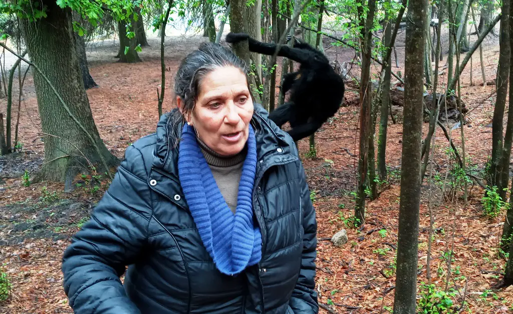 La mujer se toma 10 minutos para acceder a la entrevista y camina hasta el bosque “¡que milagrosamente se salvo” ya que allí es donde están las mayoría de las familias de los monos. En un momento se detiene, saca dos frutas de los bolsillos de la campera húmeda por las gotas de agua de lluvia que caen desde los árboles, eleva sus manos y su mirada hacia la altura, como una alabanza de agradecimiento. Y exclama: «Chicos, miren que tengo!». Al instante, aparecen misteriosamente desde las copas, que parecían vacías, dos monos que tímidamente se acercan a buscar su alimento. “Hace tanto tiempo que no reciben visitas que están un poco vergonzosos”, cuenta.
