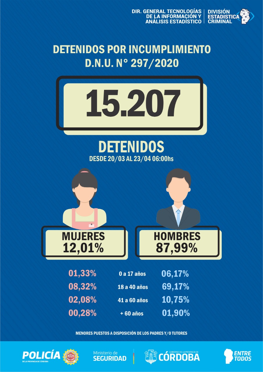 En las estadísticas de la división de Estadística Criminal de la Dirección General de de Tecnologías de la información y Análisis estadístico de la Policía de Córdoba, de un total de 15.207 detenidos, el 87,99% fueron hombres y el 12,01% fueron mujeres.