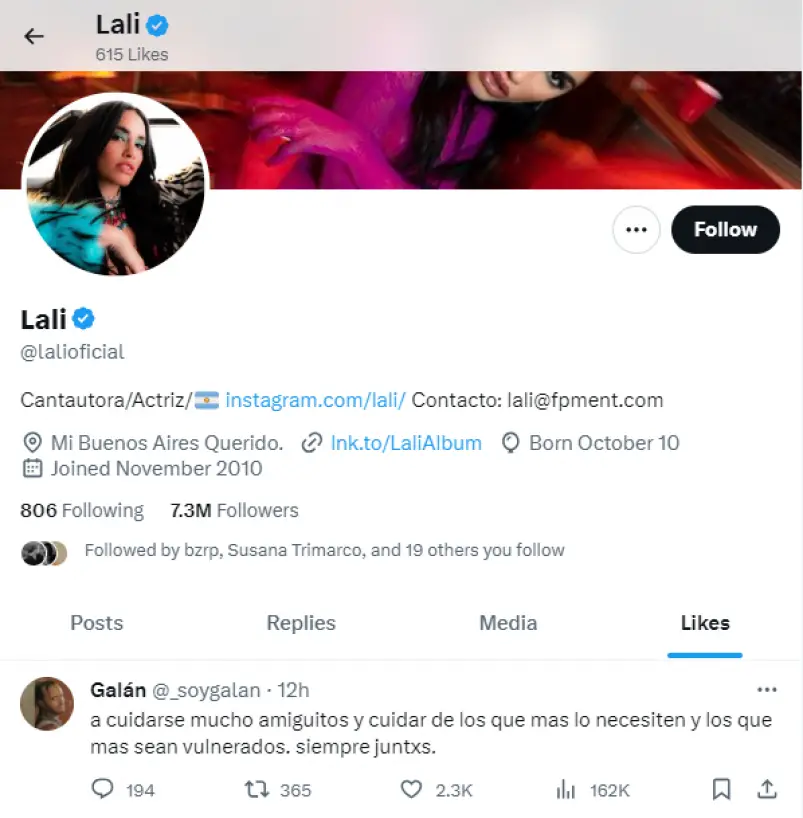 “A cuidarse mucho amiguitos y cuidar de los que más lo necesiten y los que más sean vulnerados. Siempre juntxs”, dice el tuit al que la artista pop le puso “me gusta”.