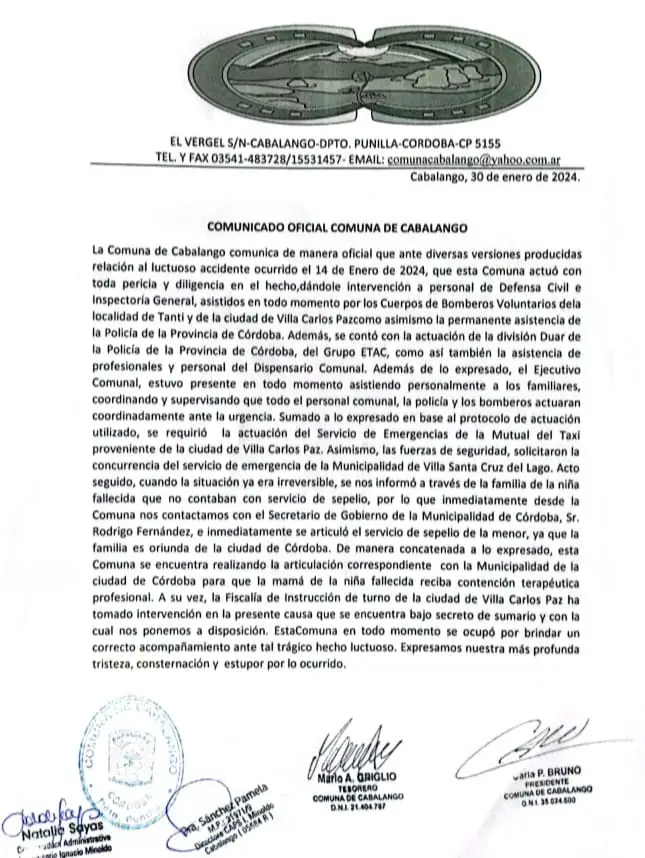 A travésd de un comunicado que se difundió en sus redes sociales, la Comuna de Cabalango planteó su explicación sobre las actuaciones que se llevaron adelante el día de la trágíca muerte de una niña de 12 en el balneario.