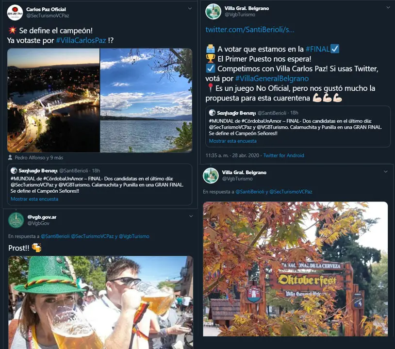 A la final llegaron Villa Carlos Paz y Villa General Belgrano, ciudades que de a poco se fueron involucrando en el concurso con su secretarías de turismo y sus cuentas oficiales.