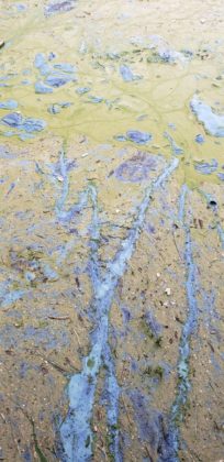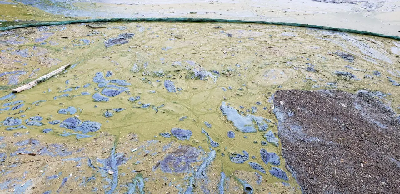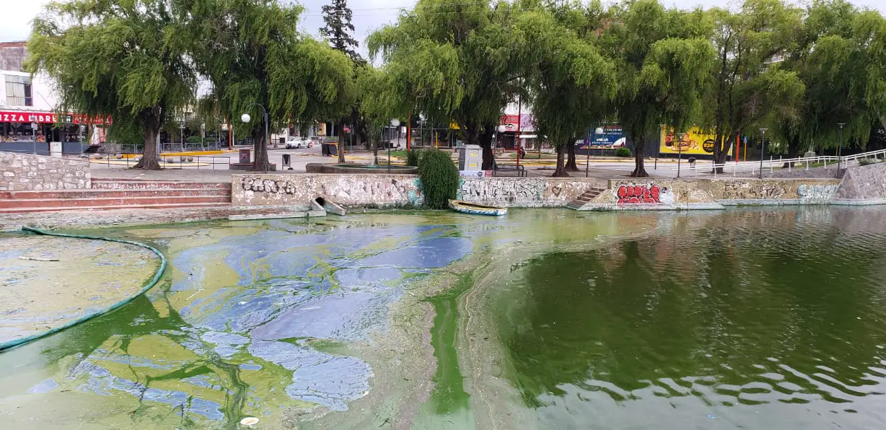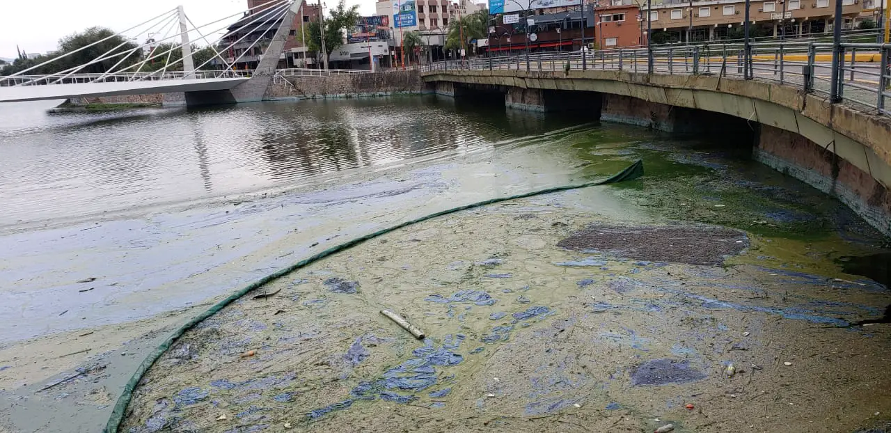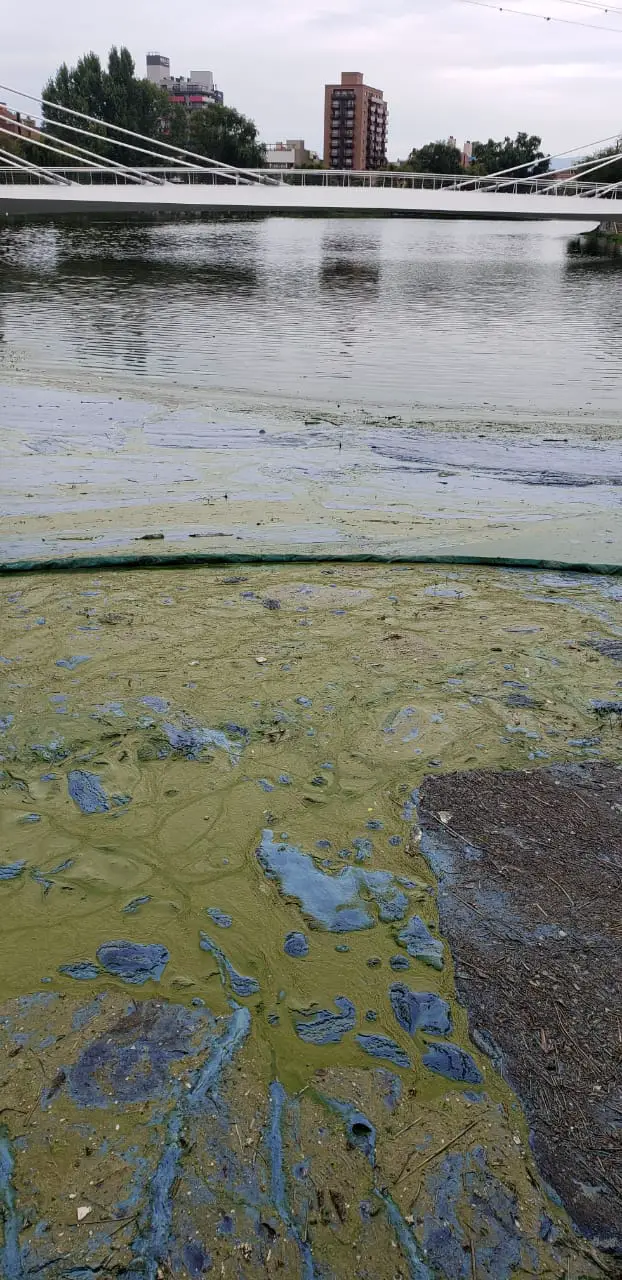En las últimas horas, se observó nuevamente el “bloom” de cianobacterias en la zona del puente central. Este fenómeno se da cuando estas plantas, de color verdoso, se amontonada de tal manera que se quedan sin oxígeno y se pudre, transformando su color a un azul, plateado que emana un olor nauseabundo.