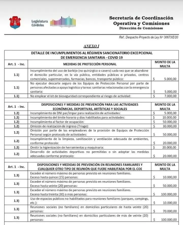 Las multas impuestas por ley en la Provincia de Córdoba por violar la cuarentena van desde los 5 mil pesos a los 100.000 pesos. De este modo, el Gobierno provincial intenta frenar las reuniones sociales y las familiares con más de 10 personas.
