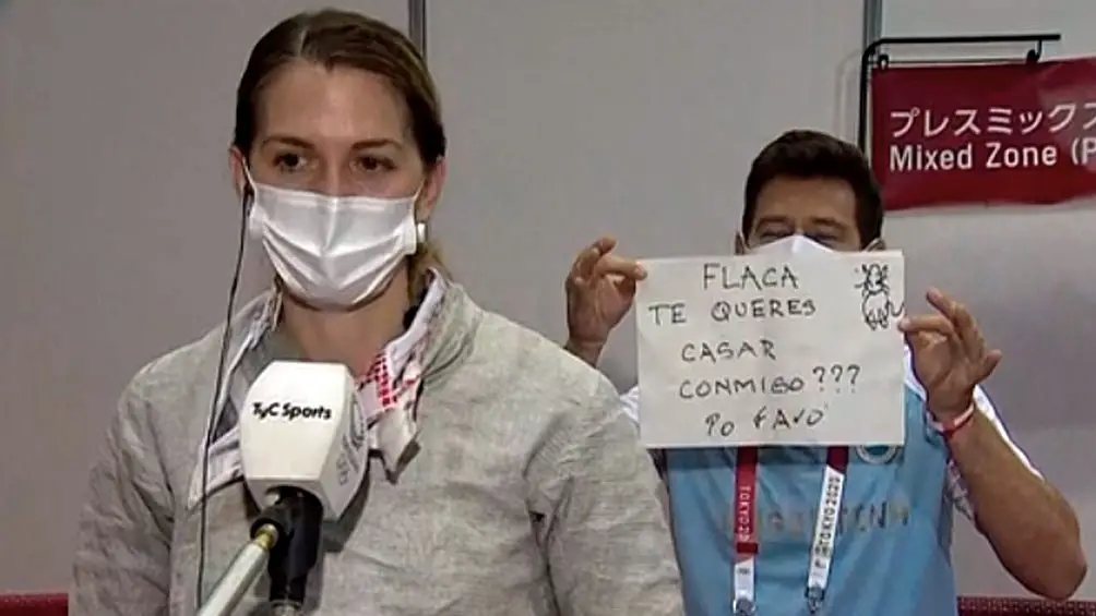 De la contrariedad por la derrota pasó a la emoción con lágrimas en el rostro cuando su pareja, el maestro de esgrima Saucedo, apareció detrás de ella y frente a las cámaras de televisión con un cartel manuscrito que proponía: “Flaca, ¿te querés casar conmigo? Por favor”.