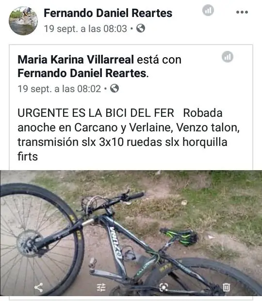 Y contó: “Al otro día a la fiesta me entero que la estaban ofreciendo para la venta pero no pude saber ni dónde ni quién la tenía”. Reartes relató que en las cámaras de seguridad del comercio se puede ver en parte cómo le robaron la bici pero no se observan rostros.