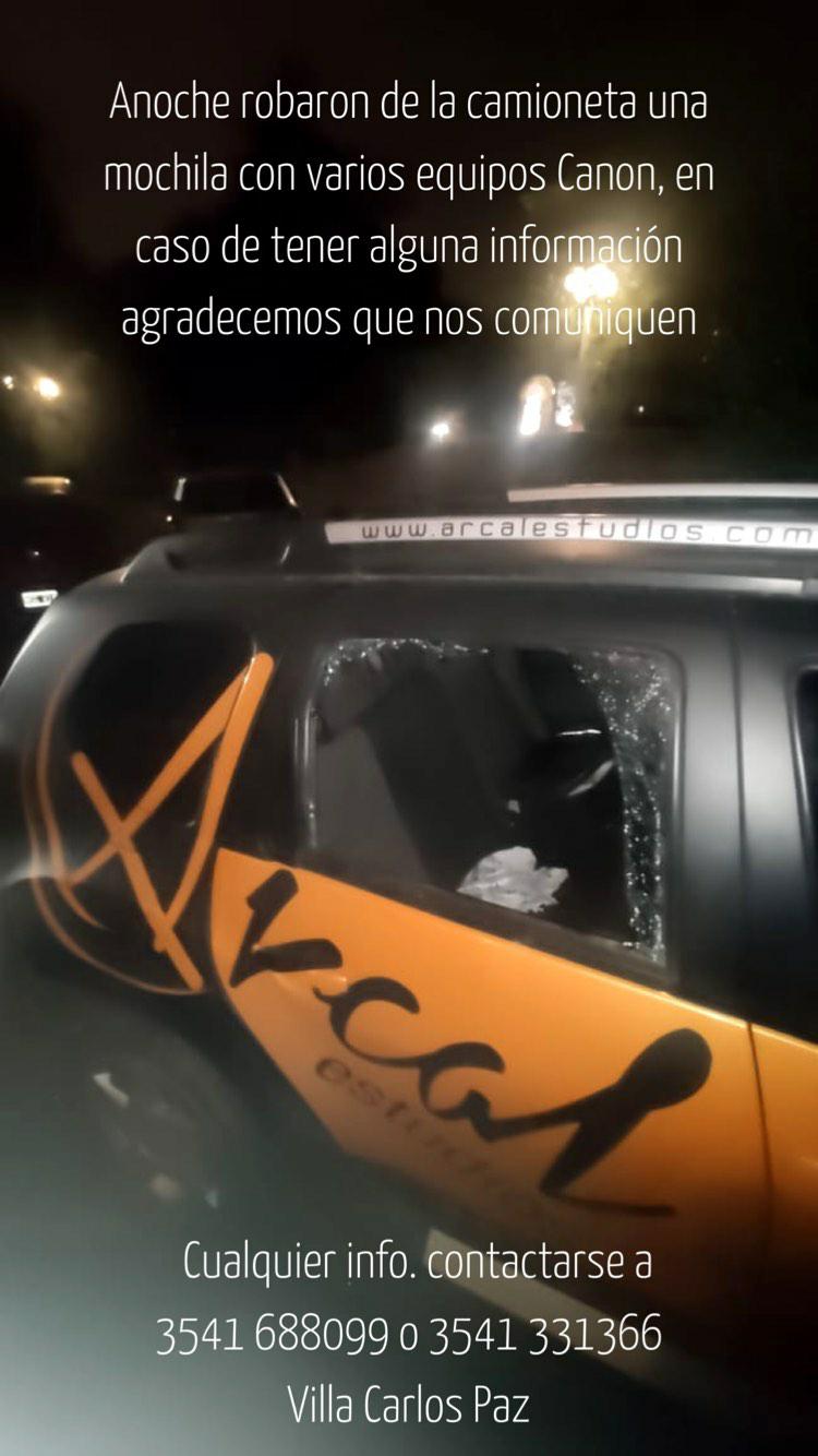 «Estuve en el salón Matilda, frente a la Casa de la Amistad, y estuve en una fiesta de cumpleaños y con mi socio estábamos sacando fotos, bajamos los equipos principales y dejamos los equipos secundarios en una mochila», le contó Pérez a Carlos Paz Vivo! y agregó: «Cuando salimos de la fiesta me di cuenta que habían roto un vidrio con una piedra y se llevaron la mochila».