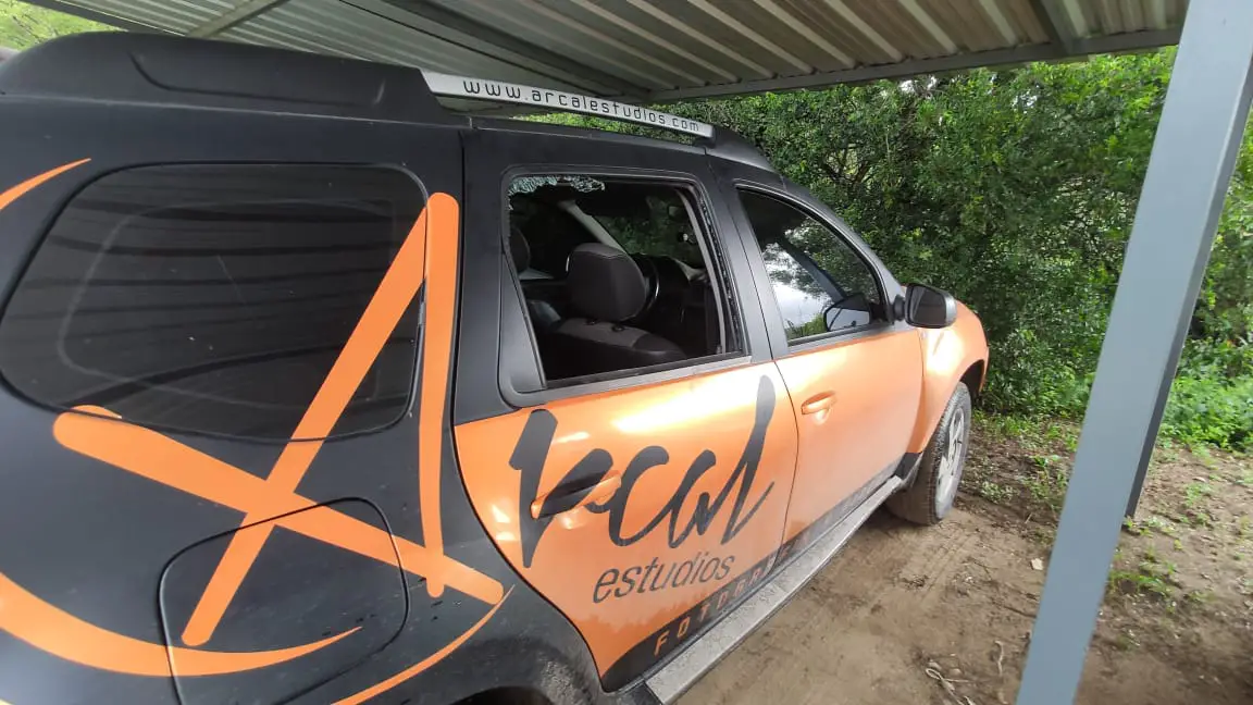 Cuando regresó se encontró con que le habían destruído el vidrio de una de las puertas traseras de su camioneta para llevarse una buena parte de los equipos con los que trabaja.