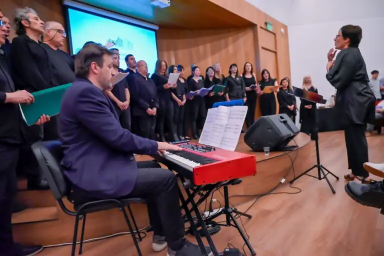 Por último, se presentó Vocal con Fusas, dirigido por Natalia Skverer e integrado por 32 mujeres, que deleitó a los presentes con su despliegue escénico de canto, bailes y coreografías. El final de la actuación fue con una ovación y el público de pie.