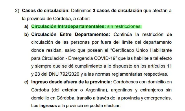 Según el último protocolo de tránsito publicado por el COE el 22 de Octubre la libre circulación intradepartamental está permitida «sin restricciones». No así entre diferentes departamentos de la provincia.