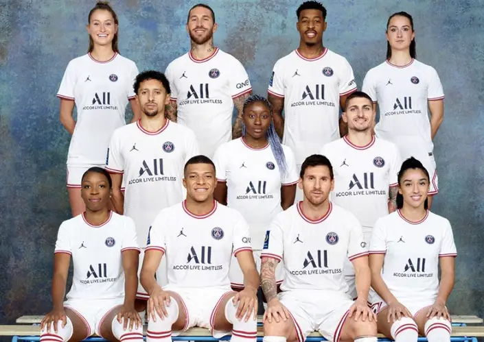 Leandro Paredes, Kylian Mbappé, Sergio Ramos, Marquinhos, Marco Verratti y Presnel Kimpembe, junto a Messi y varias jugadoras del plantel femenino, fueron los encargados de posar para las fotos que muestran la nueva indumentaria.