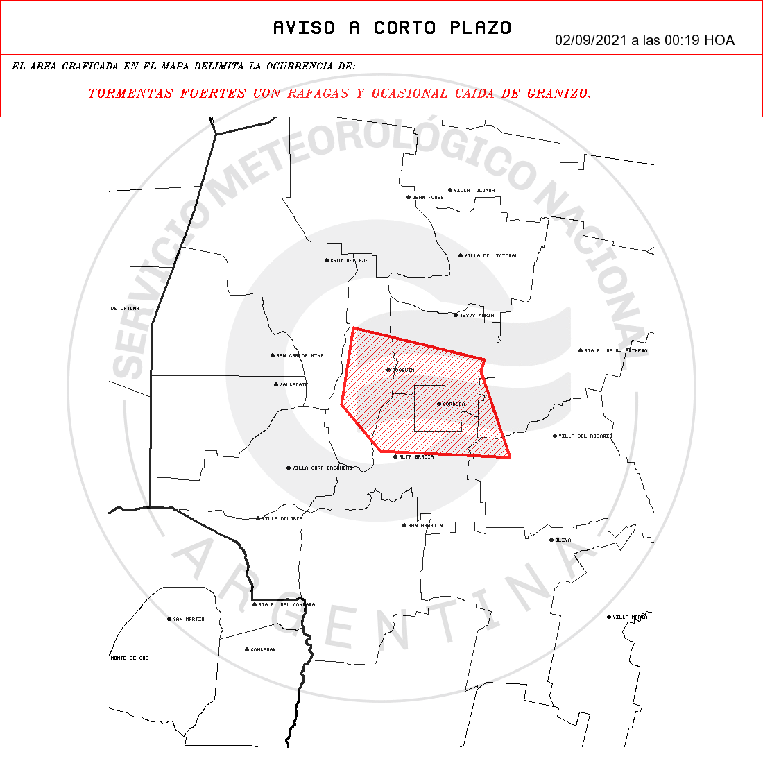 El Servicio Meteorológico Nacional emitió en los primeros minutos de este jueves un aviso a corto plazo por “tormentas fuertes, ráfagas y ocasional caída de granizo”.