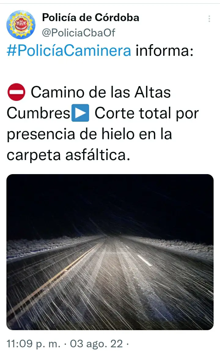 Desde la Policía Caminera informaron que el camino de las Altas Cumbres se encuentra totalmente cortado por presencia de hielo en la carpeta asfáltica.