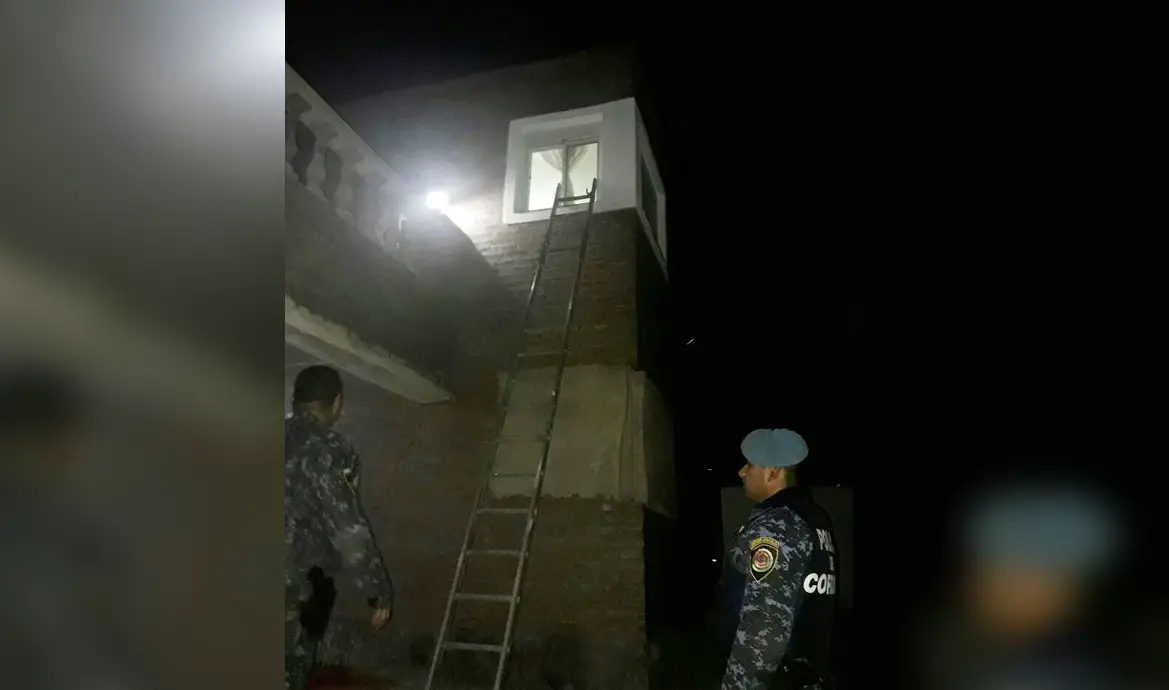 Sobre una pared de la casa, se encontraba colocada una escalera y en el interior del baño, un hombre oriundo de la ciudad de Córdoba que tenía entre sus ropas una barreta.