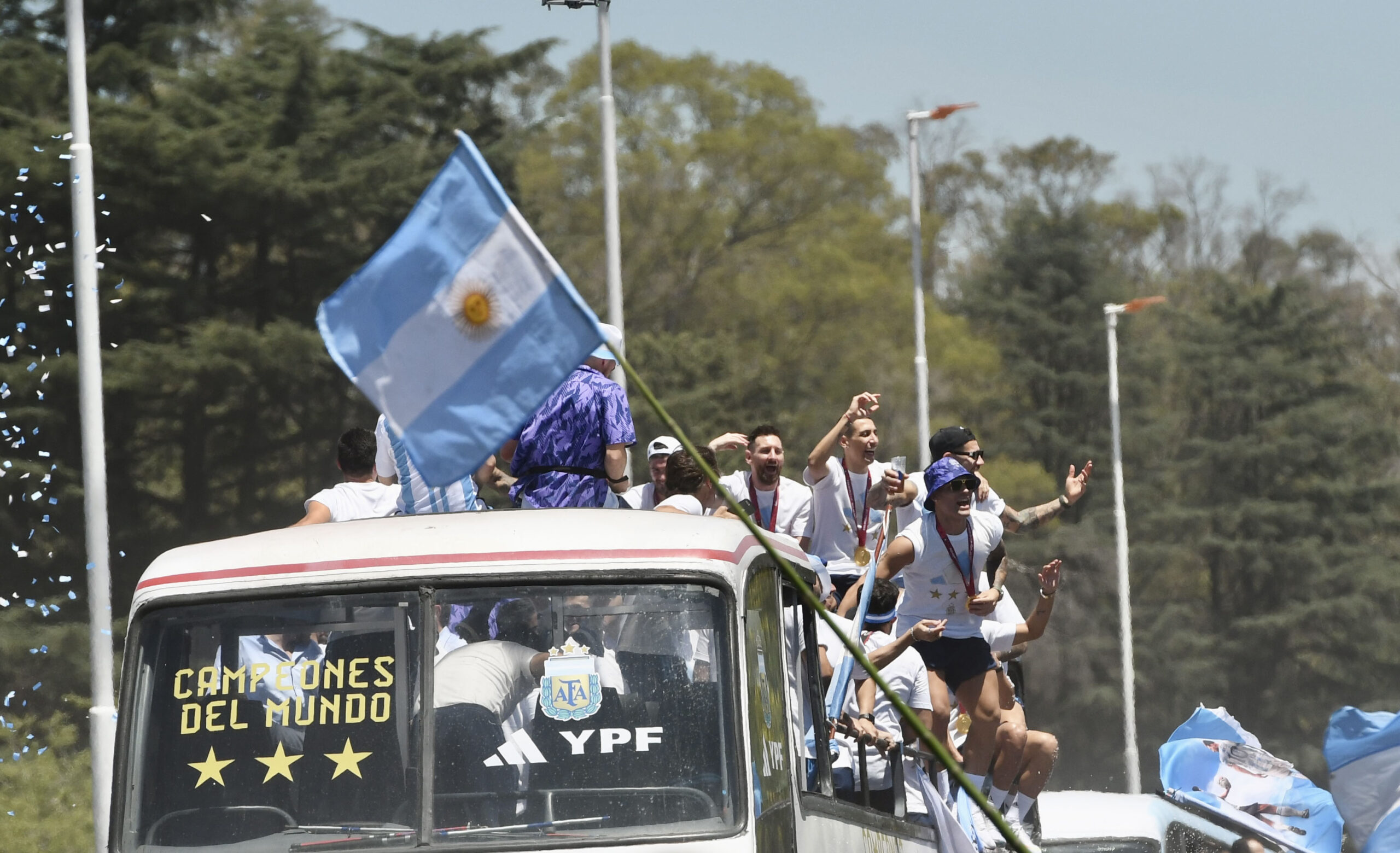 Exhibiendo la Copa del Mundo, los jugadores y el director técnico Lionel Scaloni saludan y cantan a bordo de un micro descapotado con los miles de hinchas que se distribuyen por la autopista Riccheri, en medio de un amplio operativo de seguridad.