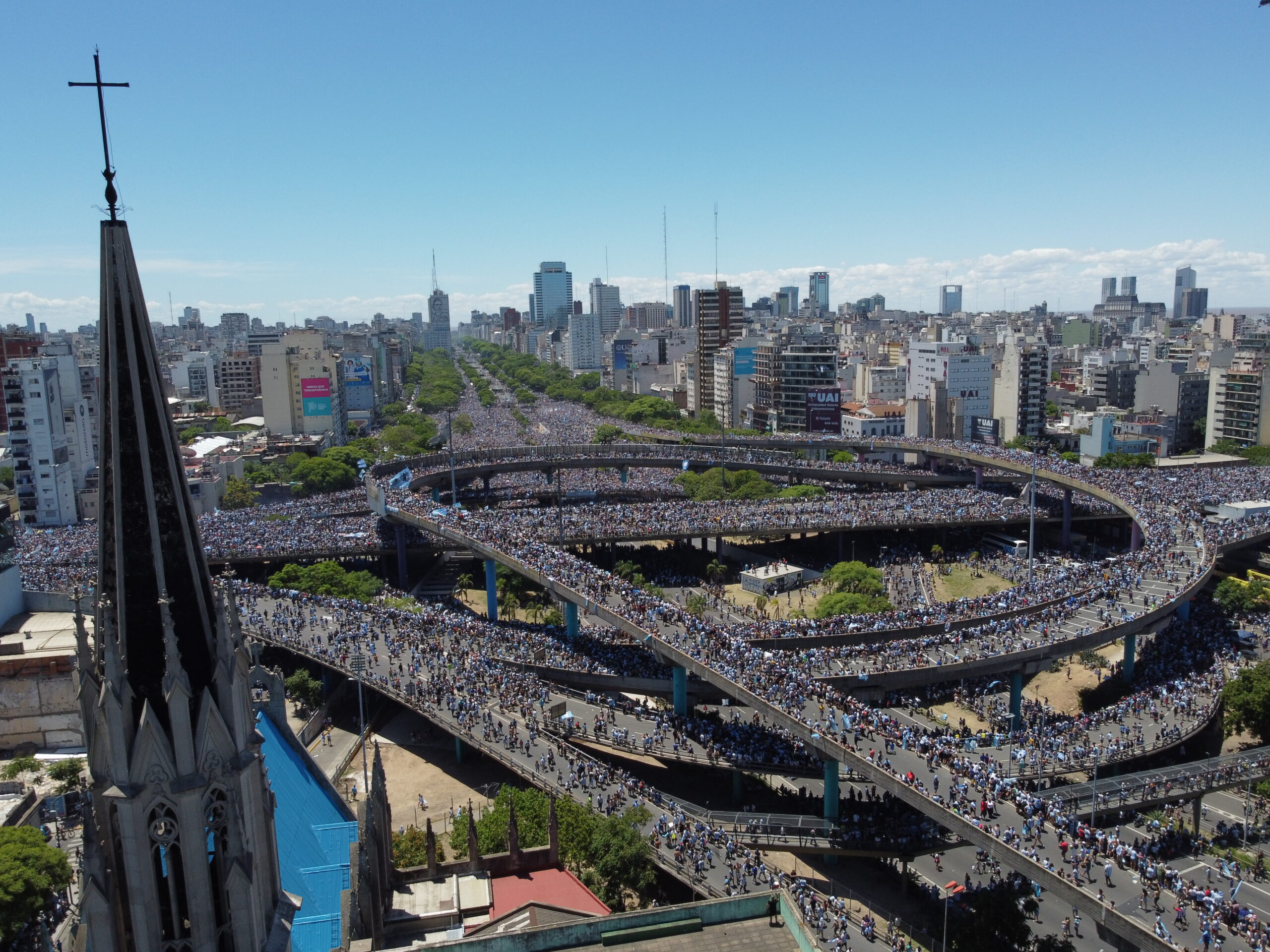 Una multitud de simpatizantes se desplazó desde el Obelisco hacia la Autopista 25 de Mayo en su intersección con la Avenida 9 de Julio al enterarse de que la selección saludará a los hinchas desde esa intersección porteña.