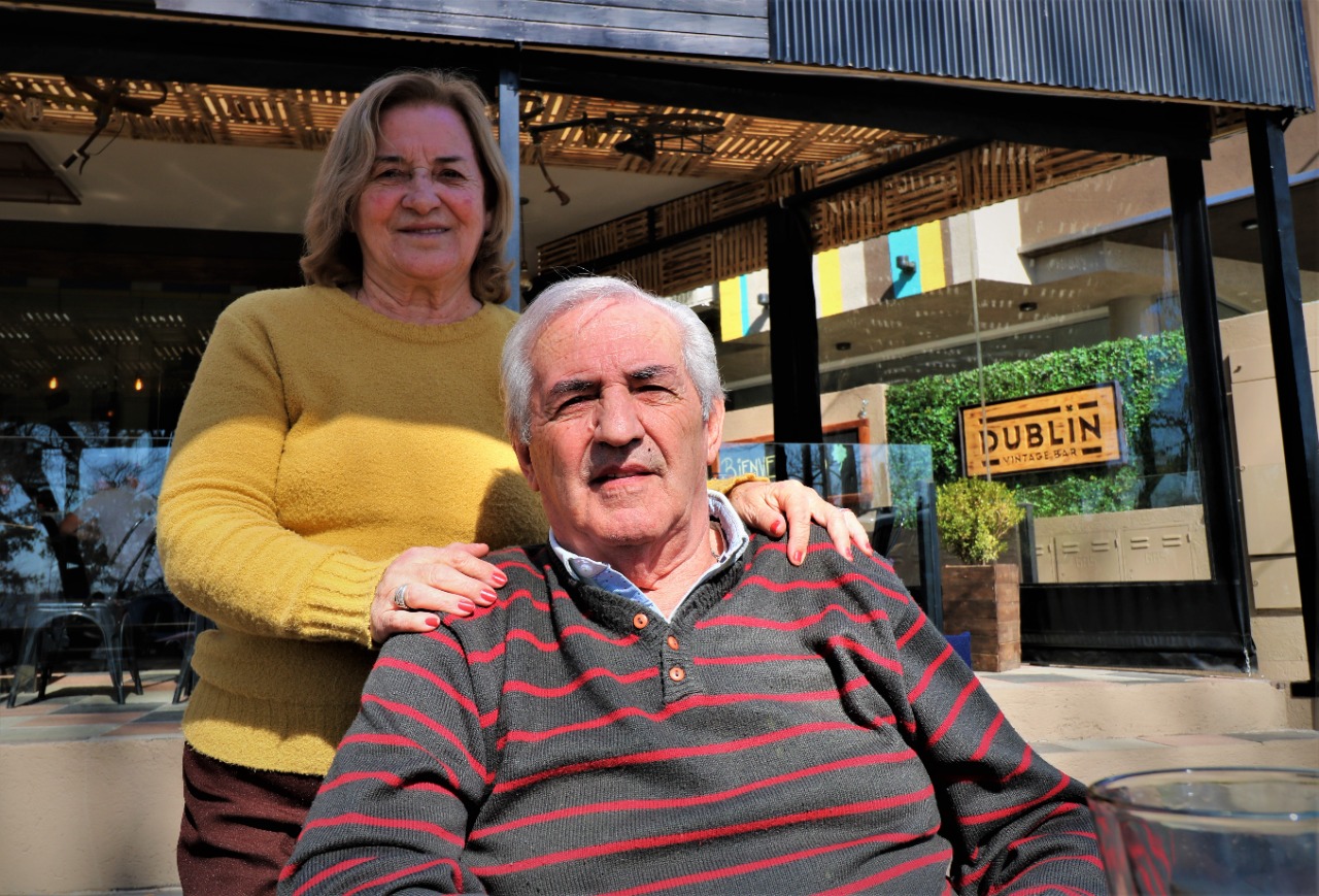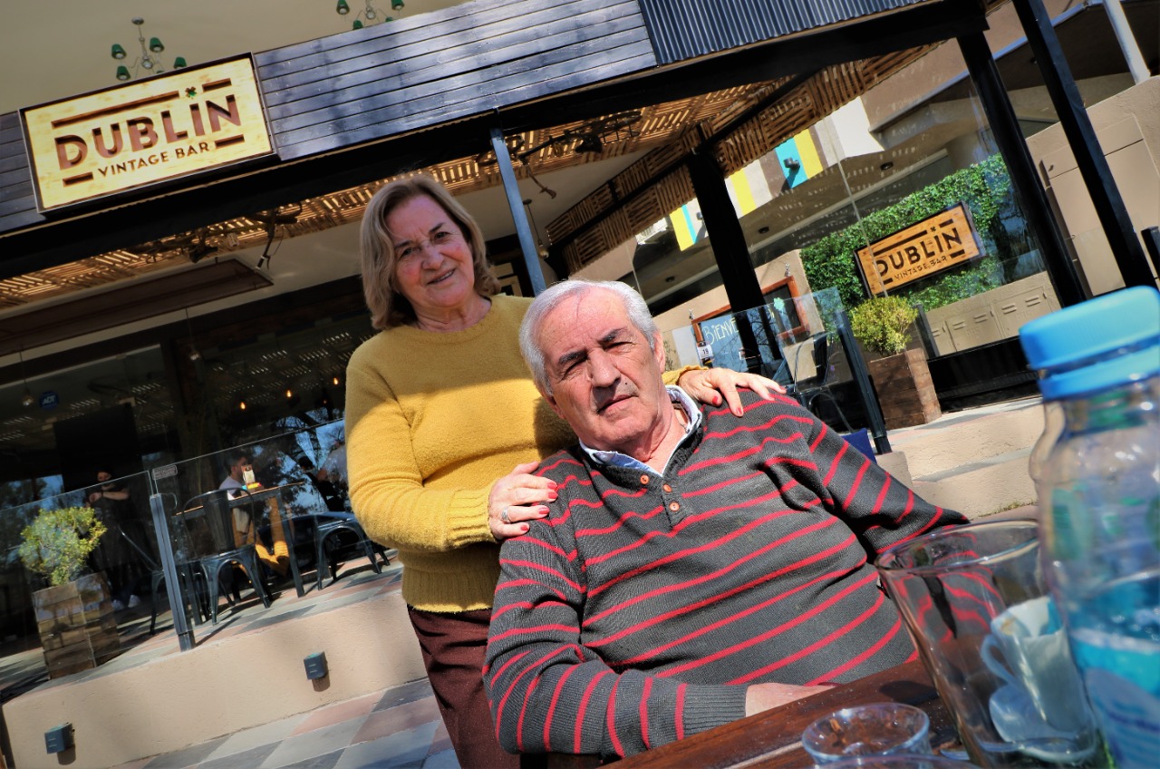 Don Carlos Gómez posa con su amor de toda la Vida, la Katy, en el Bar Dublin, en una plácida siestita soleada, tras un cafecito… y me contaba, en ese momento, que tenía su cumpleaños 80 a la vista… avistada con catalejo.