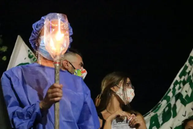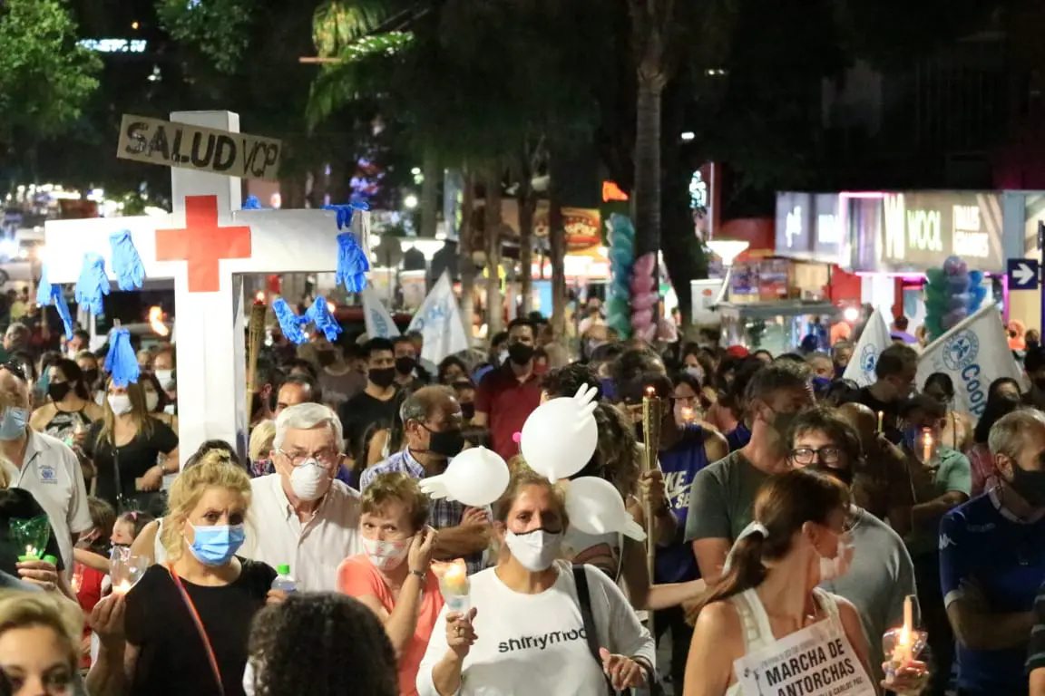 Con antorchas y vestidos con la ropa especial que se utiliza por las normas de bioseguridad por la pandemia, el personal de salud reclamó por el centro a través de pancartas y desde un megáfono se expresaban las consignas y planteos hacia el municipio.