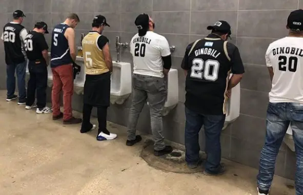 El periodista Julian Mozo, quien estuvo en la ceremonia, subió a su cuenta de instagram una foto en uno de los baños del estadio. Todos Ginobili, algunos de Spurs, otros de la Generación Dorada, pero todos “Manu”.