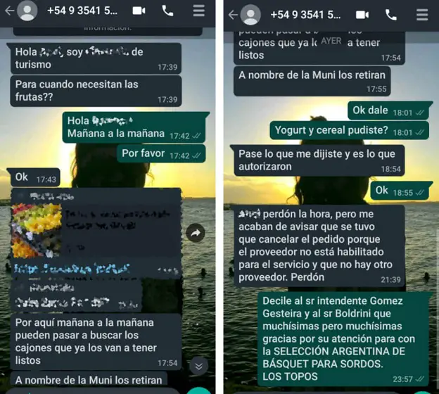 La misma persona del área de turismo de la municipalidad confirmó que podían retirar un cajón de frutas pero, casi cuatro horas después, vía mensaje cancelaron el pedido por falta de proveedor ya que el que había sido confirmado no estaba habilitado.