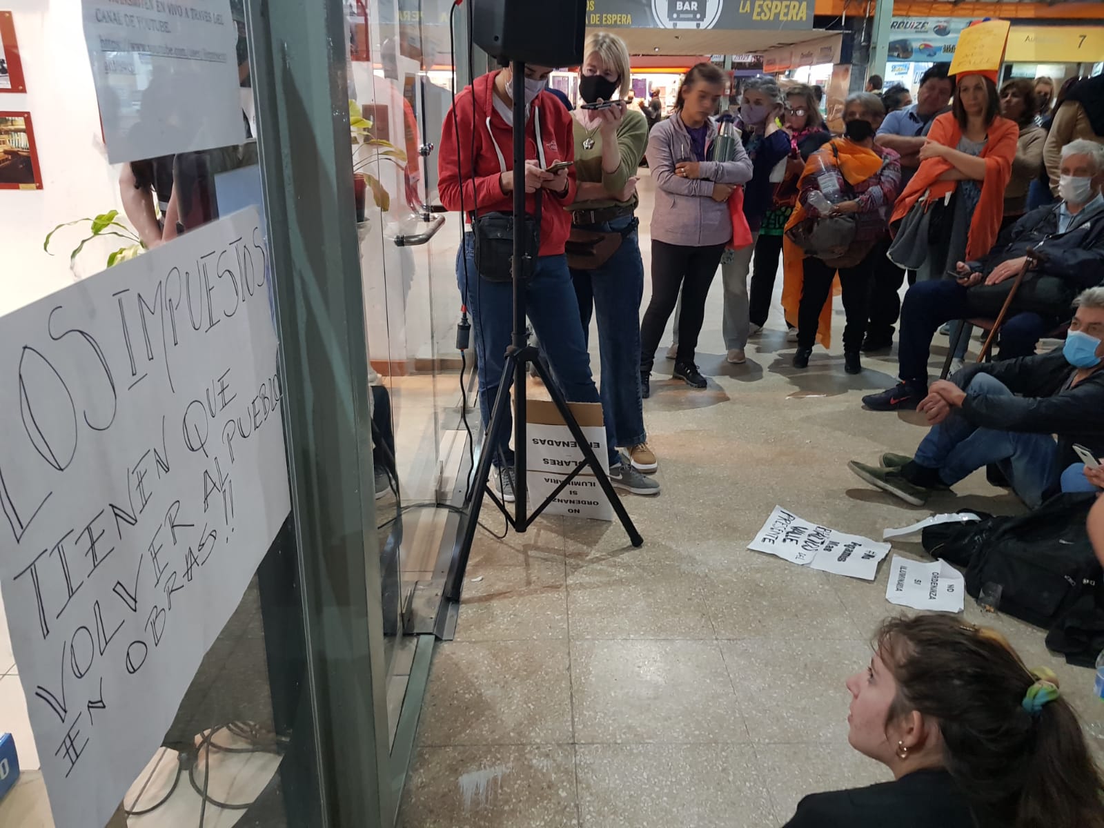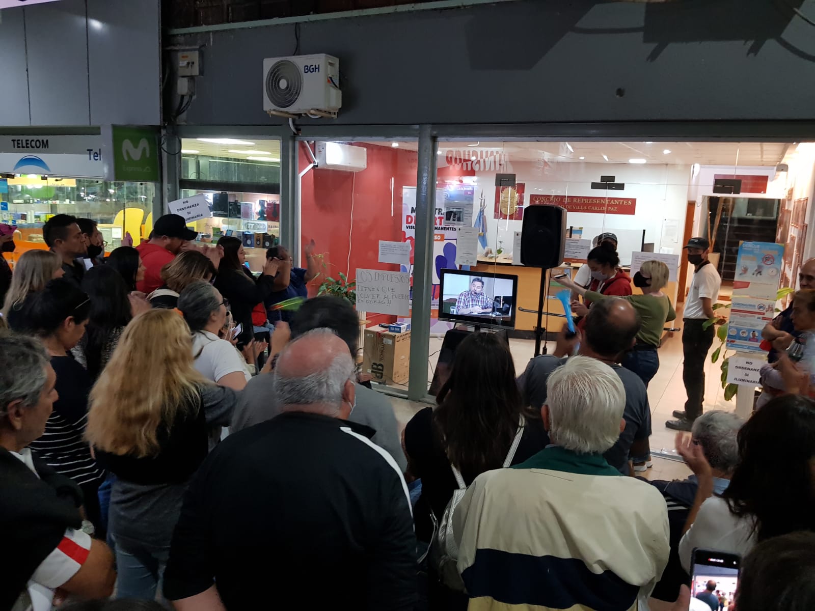 Desde afuera, un grupo de vecinos que también estuvieron en la audiencia pública, siguieron enérgicamente la sesión a través de una pantalla colocada en la puerta del Concejo.