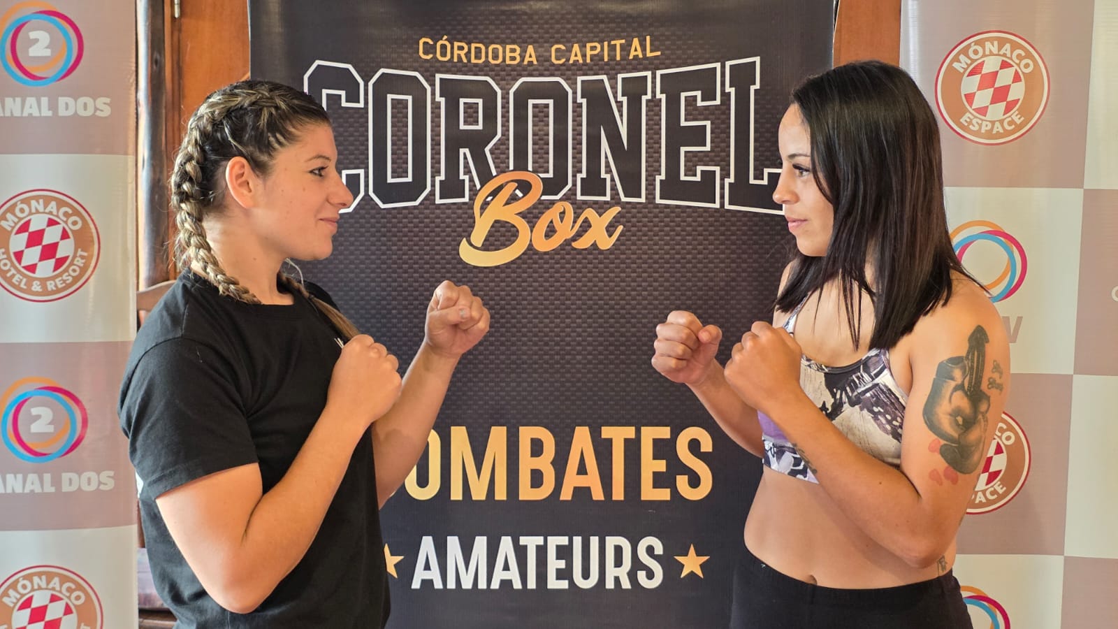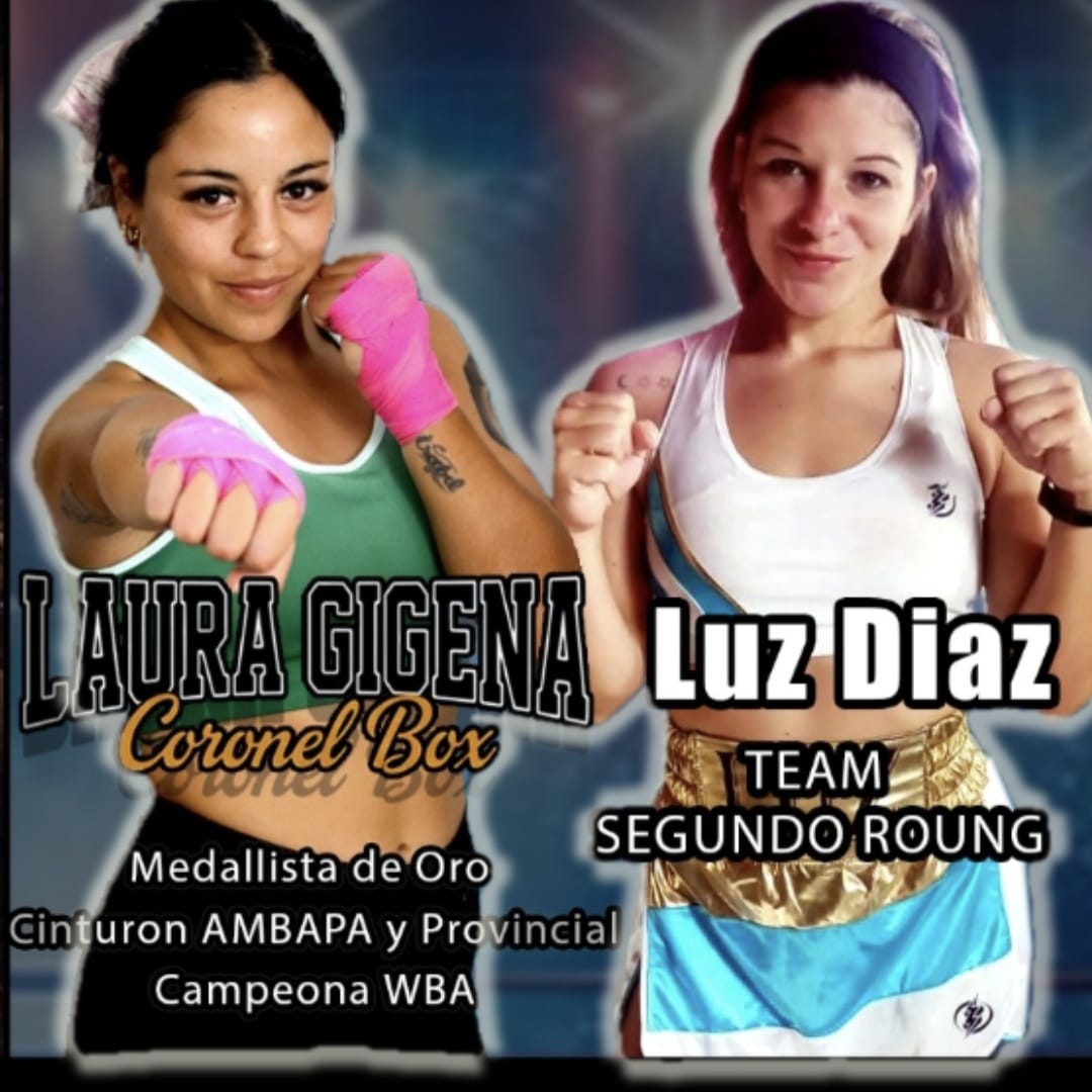 Del otro lado, a la derecha, nuestra Laurita Gigena, del Barrio Colinas de Carlos Paz, de mirada firme, como quien ya conoce el ruido de los guantes cuando la noche se pone seria. La que de día trabaja en un guardería infantil y que entrena en Saldán, viajando a diario.
