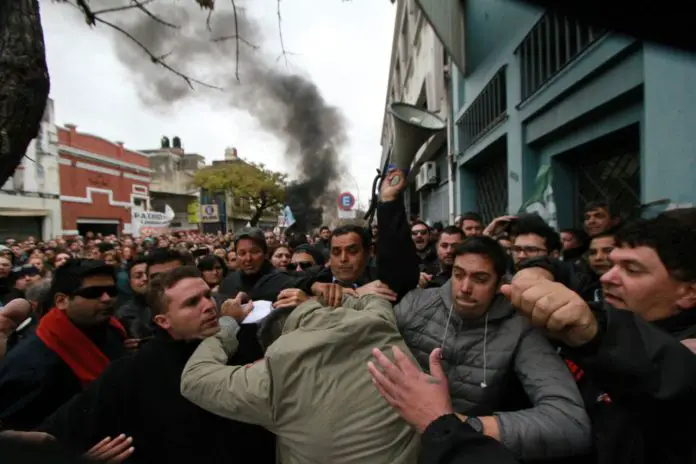 Además, los manifestantes golpearon al periodista de radio Mitre, Leonardo Guevara, y le quitaron su celular mientras estaba saliendo al aire.