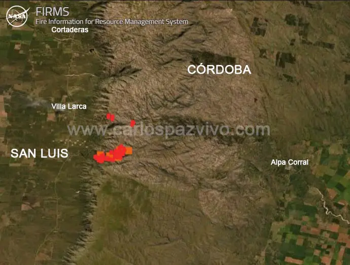 El nuevo frente de incendio ingresó por San Luis hacia Alpa Corral, en el sur provincial. Trabaja el avión vigía para reconocimiento de la situación y 8 aviones hidrantes y casi 200 bomberos en todos los focos activos