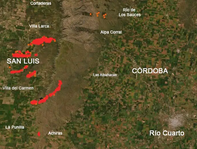 Mapa del fuego en departamentos Punilla y Cruz del Eje.
