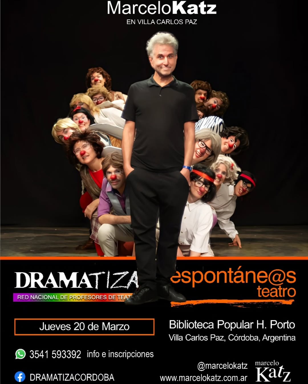 Marcelo Katz es un destacado actor, director y maestro de teatro con una trayectoria que abarca el clown, el bufón y el uso de máscaras. Desde 1985 ha desarrollado su carrera en el teatro, la danza, la música y el circo, formando parte del elenco del Teatro Municipal San Martín de Buenos Aires y de la compañía de danza de Teresa Duggan.