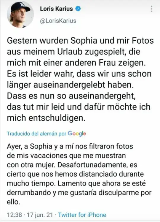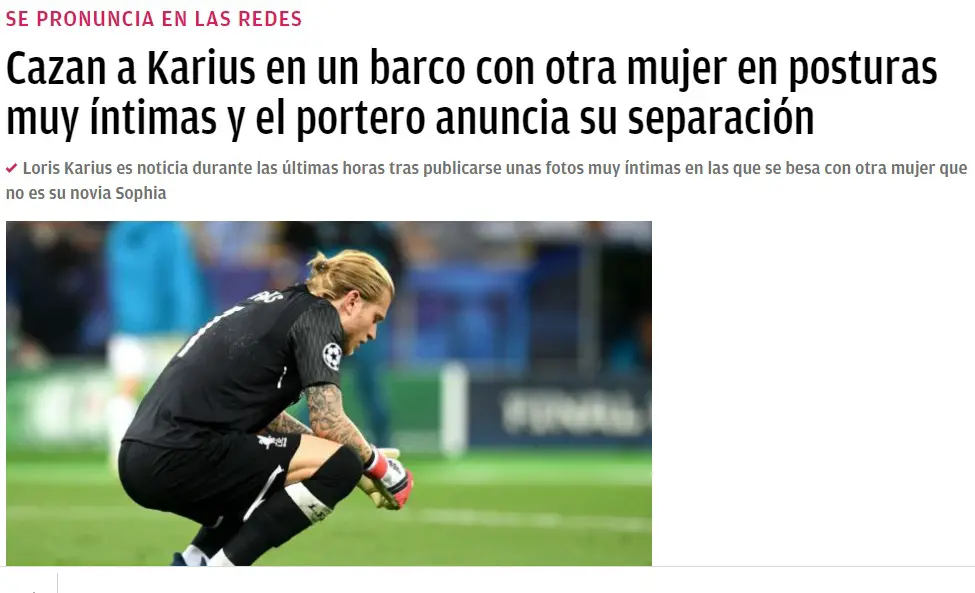 Es que los medios alemanes se encontraron con una noticia que en Argentina hubiera causado el mismo revuelo si se tratara de una estrella futbolística. Karius, casado con la famosa actriz y presentadora alemana, Sophia Thomalla, confirmó el hecho en su cuenta de Twitter y pidió disculpas a su ahora expareja.