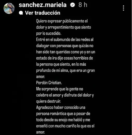 “Entré en el submundo de las redes a dialogar con personas que quizás no han sido tan queridas como yo. Y, en un estado de ira, dije cosas horribles de la persona que siento, en lo más profundo de mi alma, que era un gran amor”, remarcó Mariela para explicar el error que cometió. “Perdón, Cristian”, destacó.