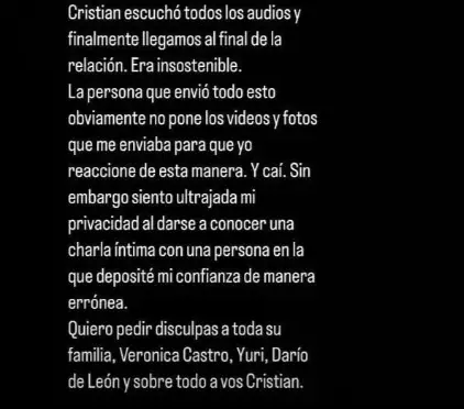 Luego, se refirió a lo que sintió por la filtración de sus mensajes. “Siento ultrajada mi privacidad al darse a conocer una charla íntima con una persona en la que deposité mi confianza de manera errónea. Quiero pedir disculpas a toda su familia, Verónica Castro, Yuri, Darío de León y sobre todo a vos, Cristian”, concluyó ella.