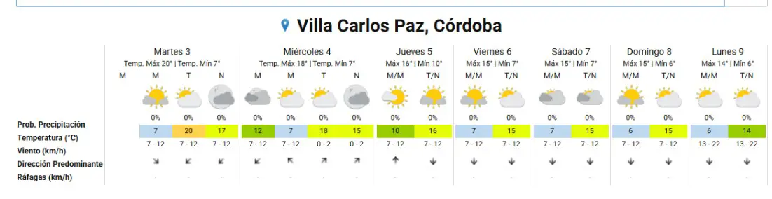 Pronóstico extendido para Villa Carlos Paz