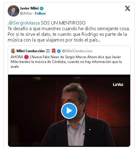 Milei se hizo cargo de responderle en su cuenta de X (antes, Twitter) con un extracto de la entrevista que dio el candidato de Unión por la Patria: “Sos un mentiroso. Te desafío a que muestres cuándo he dicho semejante cosa. Por si te sirve el dato, te cuento que Rodrigo (Bueno) es parte de la música con la que viajamos por todo el país”.
