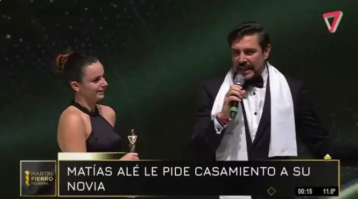 Según informa Teleshow, un inesperado momento se vivió en los Premios Martín Fierro Federal cuando Matías Alé, después de ganar en la terna Labor Animación Masculina por el programa Showbeach que condujo en la televisión de Villa Carlos Paz, en medio de su emoción le propuso casamiento a su novia, Martina Vignolo, sobre el escenario y en plena gala.