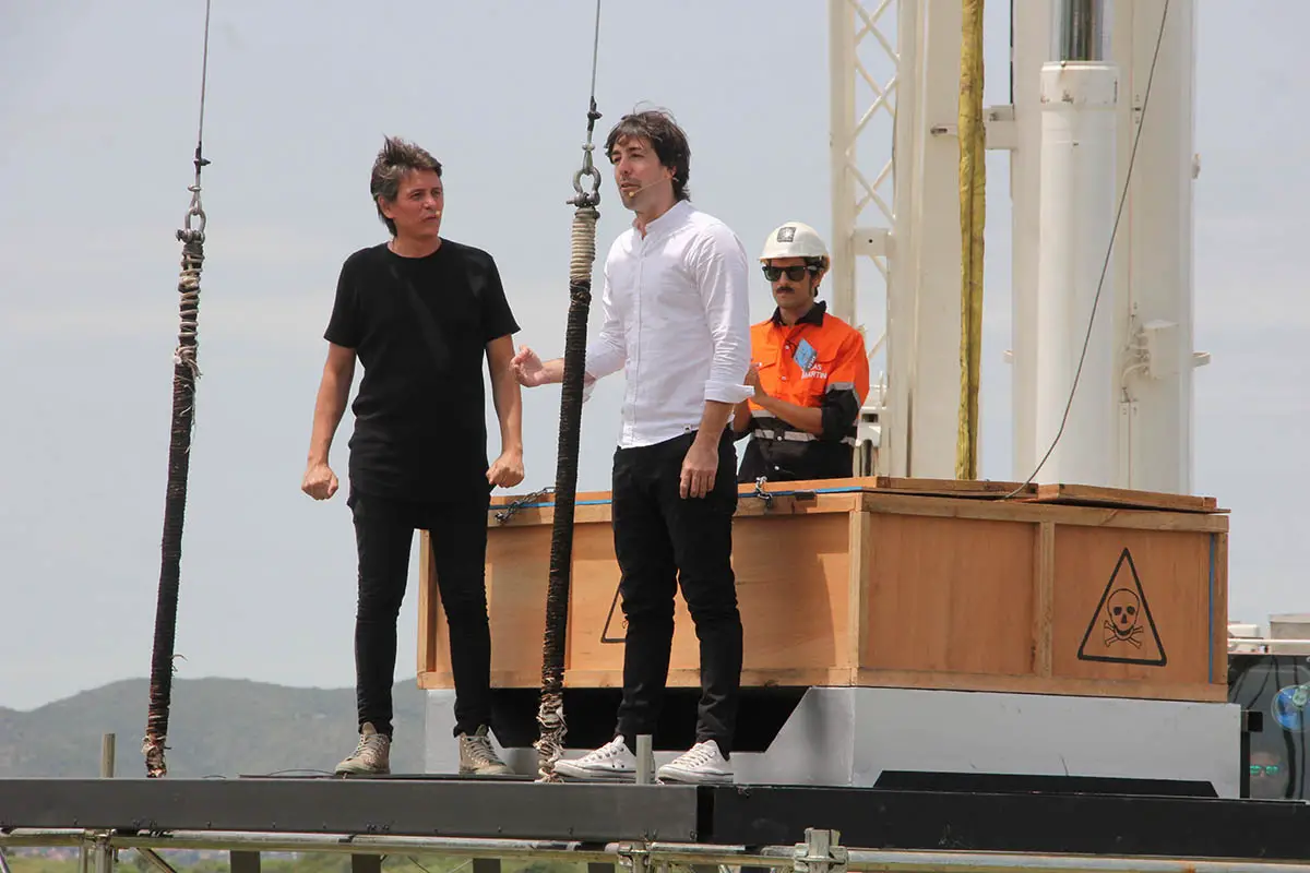 Matus llegó en un helicóptero acompañado de su colega y amigo Willy Magia para, minutos más tarde juntos, meterse en un cajón de madera que quedó suspendido a 30 metros de altura.