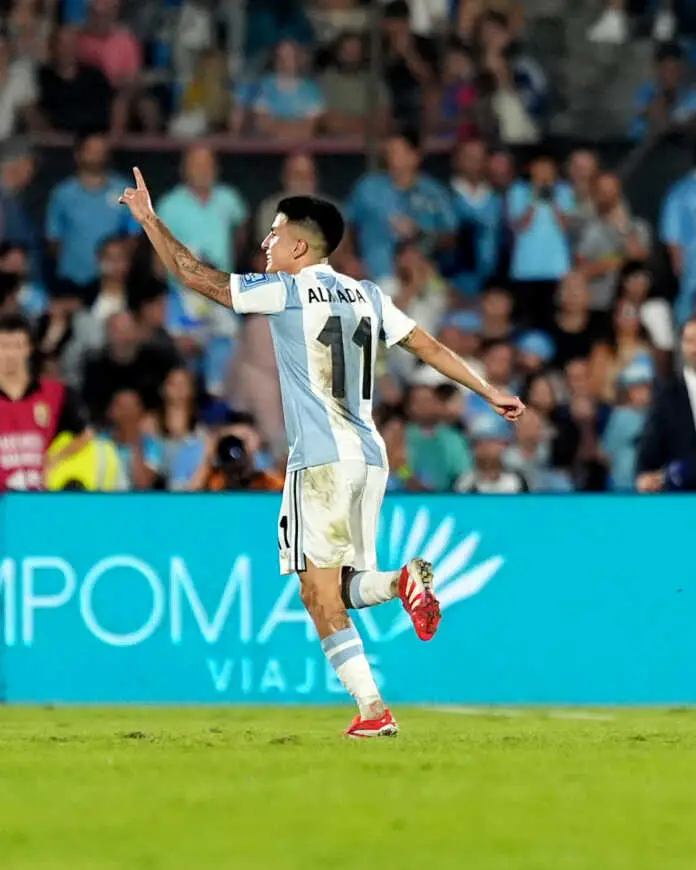 Fue el primer gol de Thiago Almada en la Selección Argentina de mayores. El juvenil marcó un golazo en la segunda etapa del partido en el que el seleccionado le ganó a Uruguay en Montevideo en el cruce del clásico sudamericano por las Eliminatorias para el Mundial 2026.