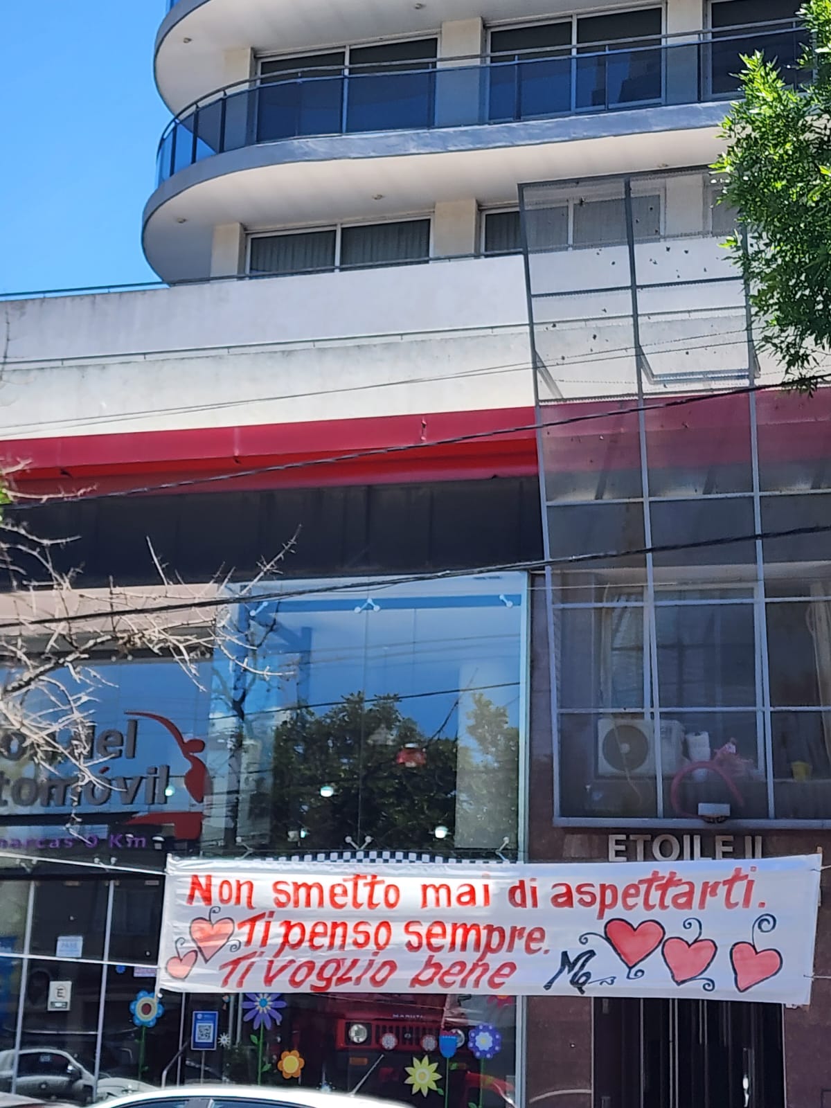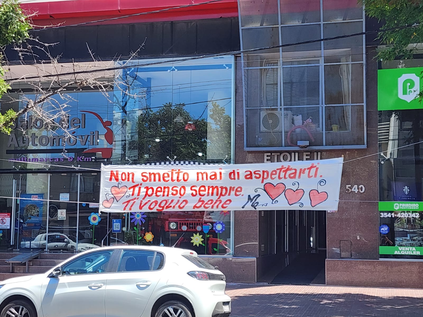 Un pasacalle escrito con corazones y una frase en italiano tiene intrigados a los vecinos de Avenida San Martín al 500. Dicen que el miércoles por la noche una joven rubia, con la ayuda de otra persona, desplegó un pasacalle cargado de romanticismo frente a la fachada del edificio Etoile II y la inmobiliaria Paladino. Solo unos pocos vecinos alcanzaron a verla: llegó, instaló el cartel y se retiró con rapidez.