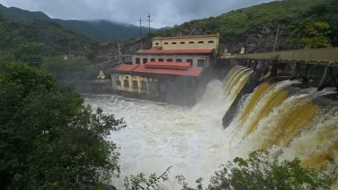 El Río Suquía en su máximo caudal, el que le brinda el embudo del Dique San Roque evacuando con ganas y las dos válvulas abiertas al 100% formando la famosa “Cola de la Novia”… visto así, un par de kilómetros más allá del recio muro, en la Usina Molet.