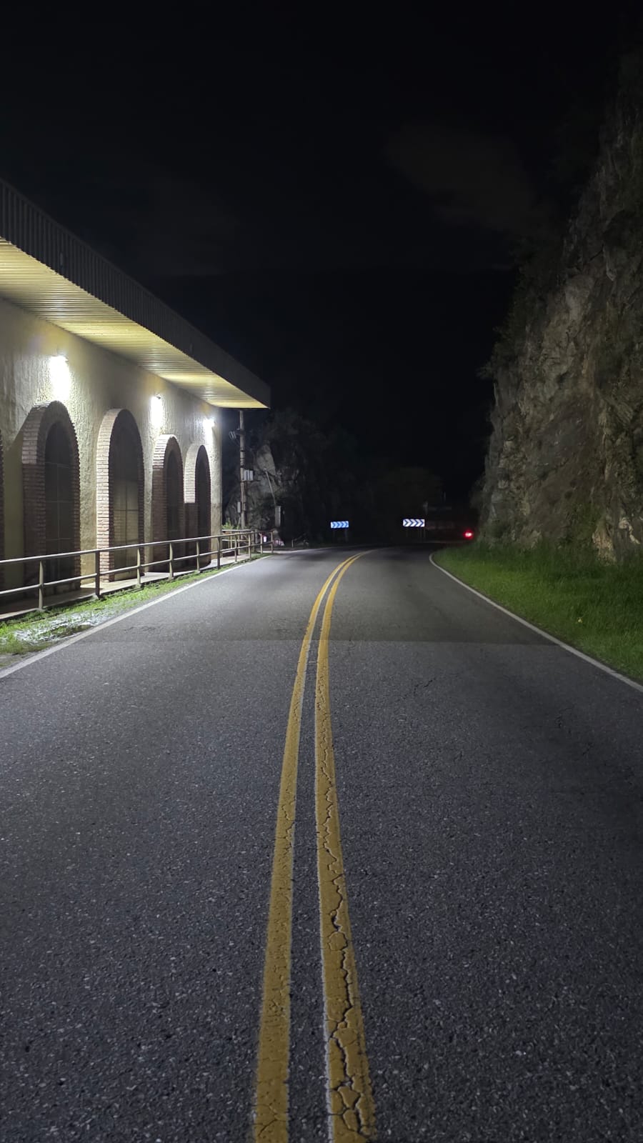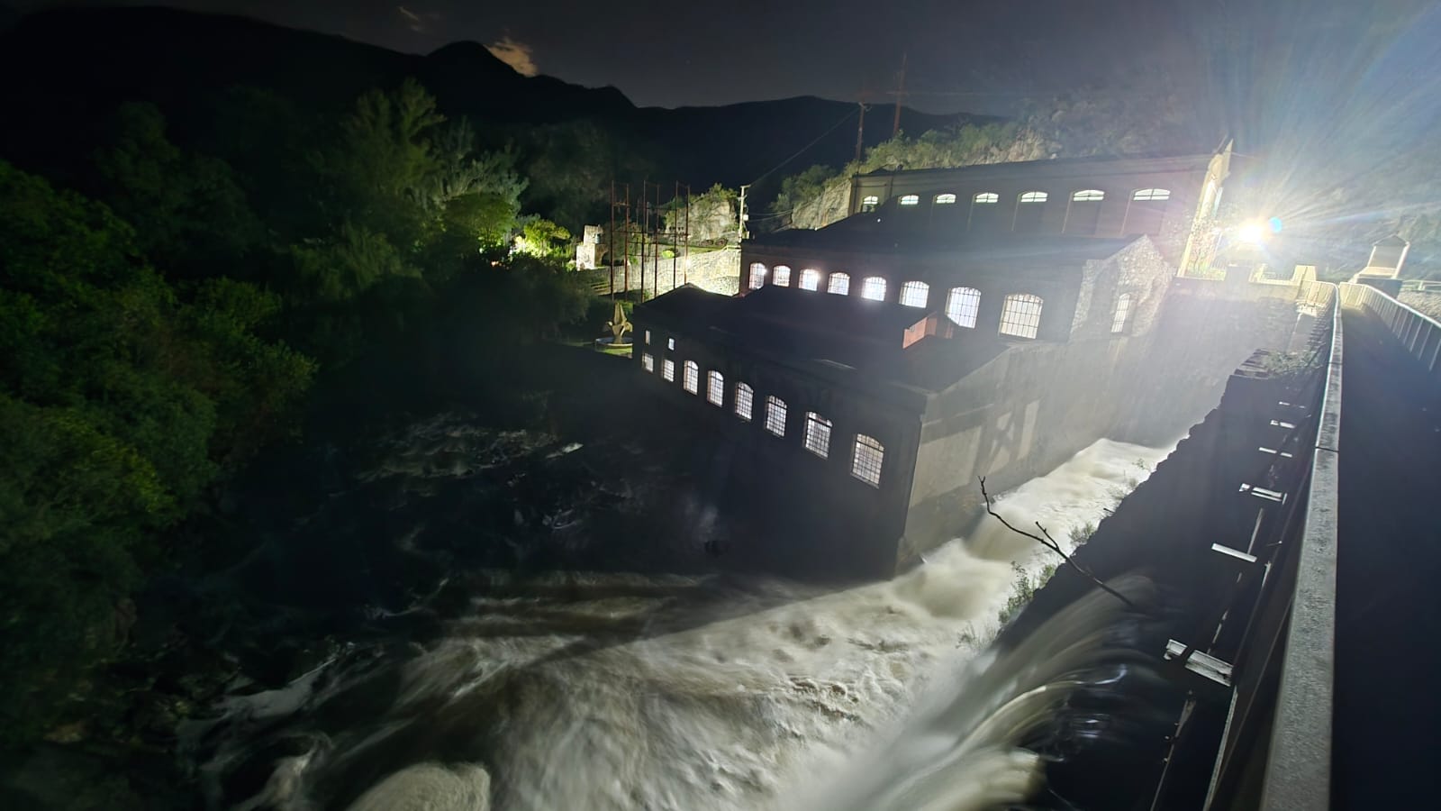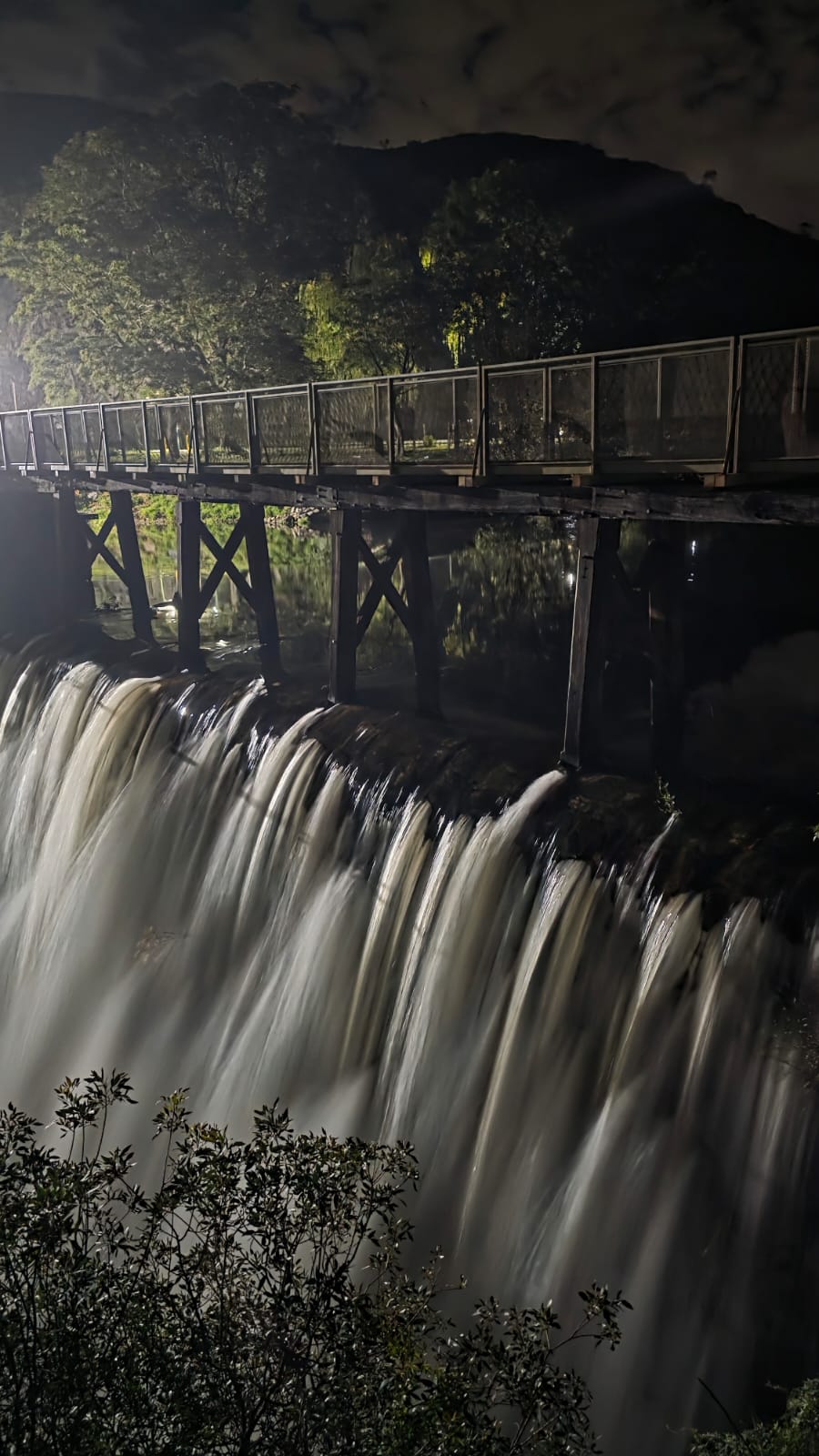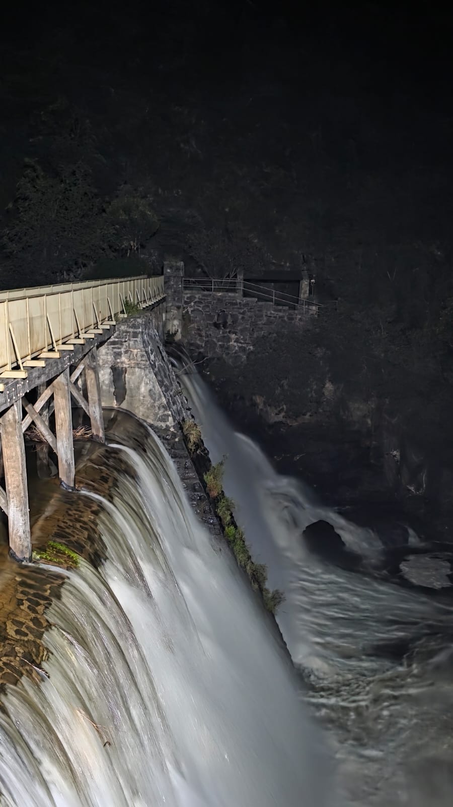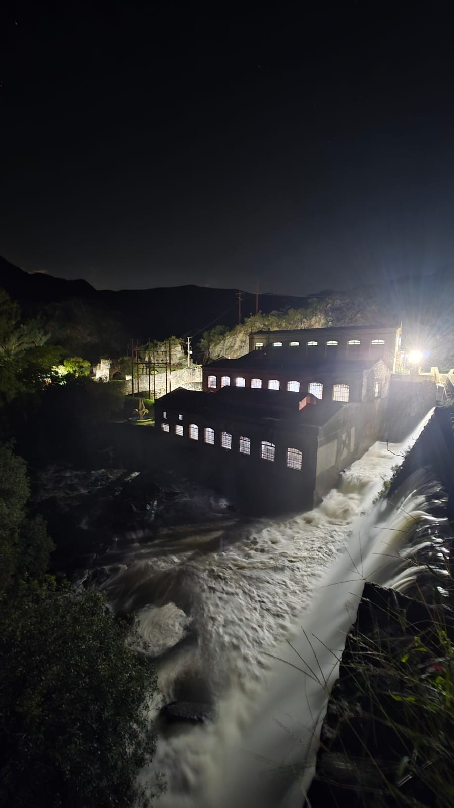 Las ventanas iluminadas parecen ojos atentos en medio de la montaña. El agua cae con furia blanca, espesa, casi rabiosa. No descansa. No hay sueño para el río. No hay pausa para la energía. El rugido se mete en el pecho y la humedad se vuelve protagonista. La luz artificial corta la oscuridad como un reflector sobre escenario natural.