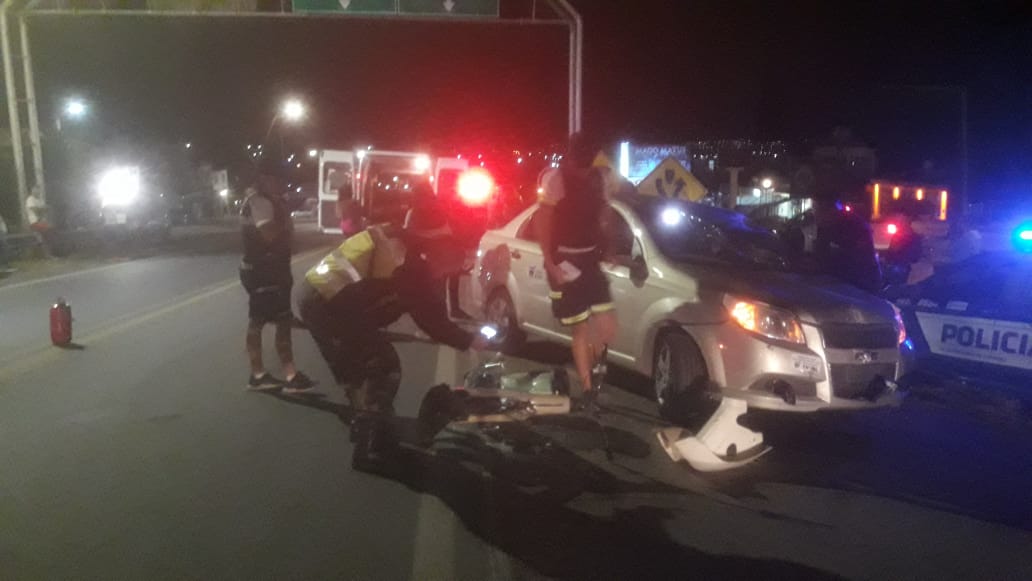 El rodado de menor porte, tripulado por un joven de 18 años, chocó contra la parte frontal del Chevrolet Aveo que funciona como taxi; lo que hizo que el motociclista impactara contra el parabrisas y terminara despedido a cuatro metros detrás del automóvil.