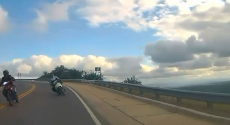 La situación alcanzó su punto crítico cuando, en una de las curvas cercanas a Valle Hermoso, las motos cruzaron de carril en plena aceleración, obligando al conductor de un auto a maniobrar bruscamente hacia la banquina para evitar una colisión frontal. El estrecho margen entre la vida y la muerte se hizo evidente cuando el vehículo apenas evitó traspasar el guardarraíl.
