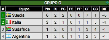 En la segunda jornada del Grupo G, donde Argentina igualó 2-2 ante Sudáfrica, Suecia hizo lo propio ante Italia y la goleó 5-0 para mantenerse en la cima de las posiciones. Esto lo abre una chance a la Albiceleste para meterse entre los 16 mejores equipos de la Copa del Mundo si se dan algunos resultados.