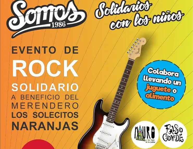 Dicen que no hay nada que valga más que la sonrisa de un niño, y justamente con ese propósito, es que la banda de rock local “Somos 1986” organizó un festival solidario para colaborar con el merendero Los Solecitos Naranjas, que asiste a 275 niños que diariamente concurren a tomar su copa de leche. Por eso, el próximo domingo a las 16, en la Costanera se llevará a cabo un evento musical que tendrá por objetivo juntar juguetes y alimentos no perecederos.