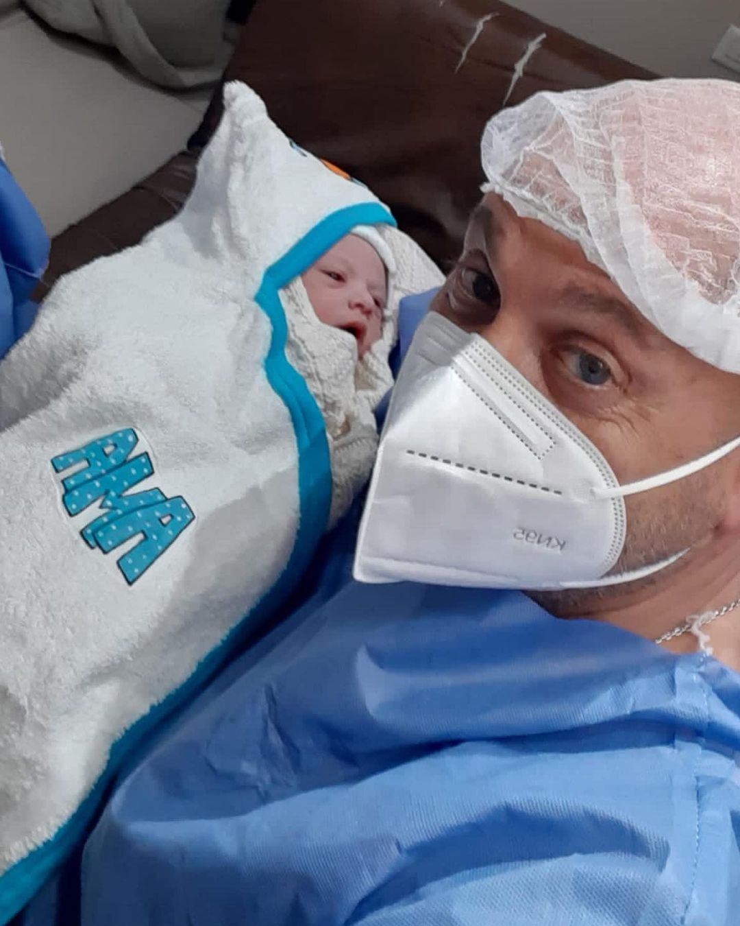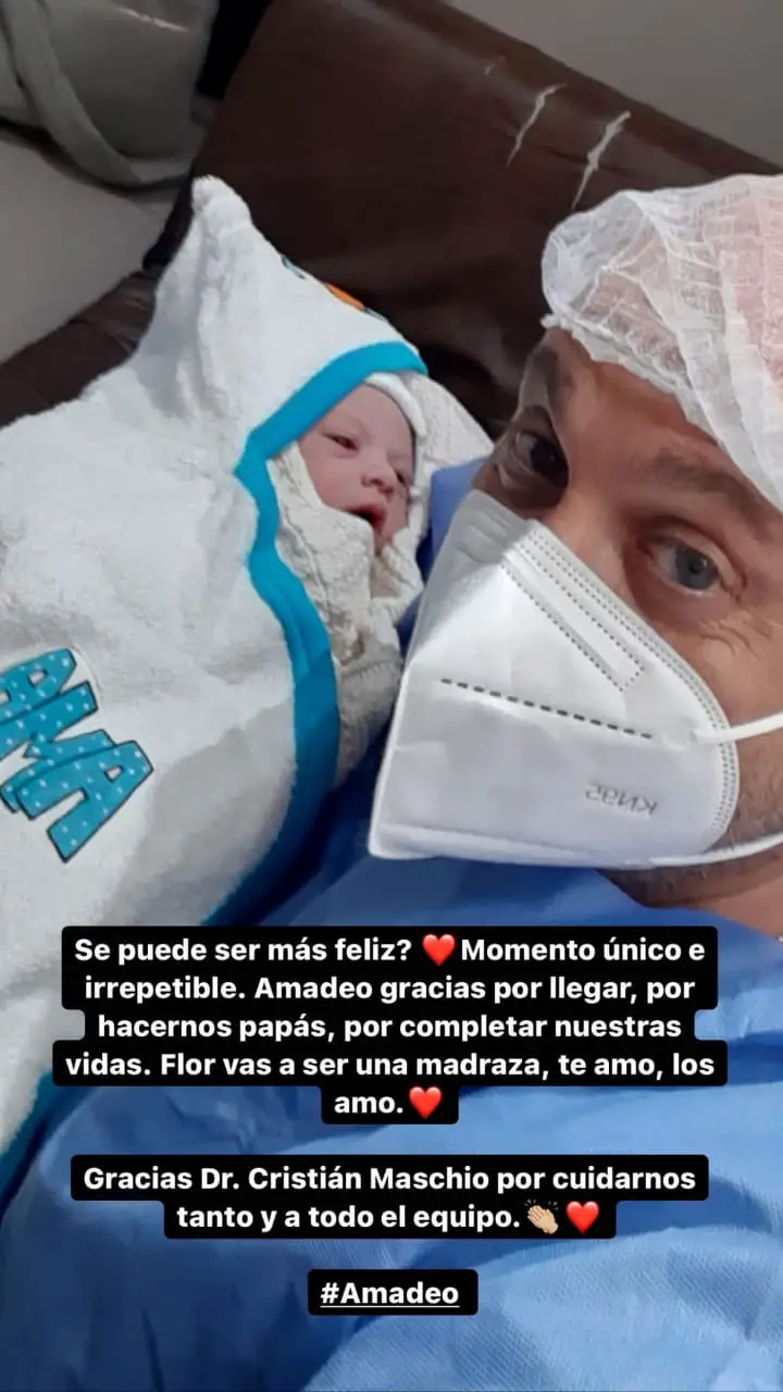 “¿Se puede ser más feliz? Momento único e irrepetible. Amadeo, gracias por llegar, por hacernos papás, por completar nuestras vidas. Flor vas a ser una madraza, te amo, los amo. Gracias Dr. Cristian Maschio por cuidarnos tanto y a todo el equipo”, escribió el intendente en sus redes.