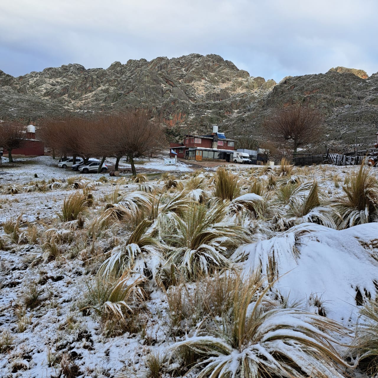 Las bajas temperaturas registradas en altura y el cielo completamente cubierto generaron las condiciones ideales para la caída de nieve, que luego fue registrada en fotografías por la gente del lugar.